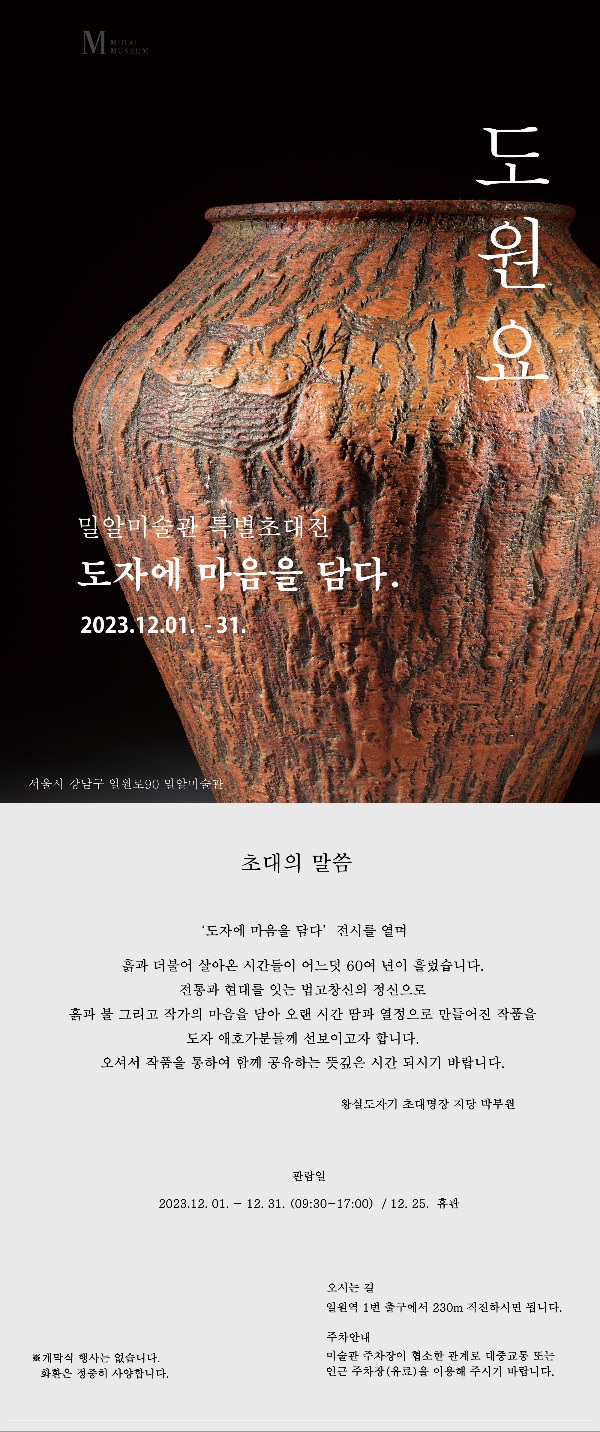 지난 5월에 도자기엑스포공원에서 열린 광주왕실도자기 축제에서도 작품전시관에서 선생님의 달항아리를 만나 반가웠는데, 최근에 차도원에 갔다가 상설 전시된 작품들이 달항아리 중심인 것을 보게 되었다. 고고미술사학을 전공한 박부원 도예가의 딸이자 도원요 큐레이터인 박소영 선생으로부터 전시회 소식을 들었다. 밀알전시관에서 12월 한 달 동안 전시회를 진행한다는 거였다. 주제는 “도자에 마음을 담다” 라고 했다. 반가운 소식이었다. 전시회 준비과정을 물어보았다. 어떤 작품이 전시되는지 묻자 전시관으로 안내해 주었다.