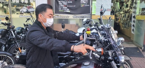 약 3시간의 세미나를 마치고 문 앞에 있는 여러 대의 바이크가 있는 곳으로 모두 발길이 옮겨졌다. 바컨님이 한 번 타보라는 말씀에 내가 타 보고 싶은 바이크에 올라 사진 한 컷 ㅋ