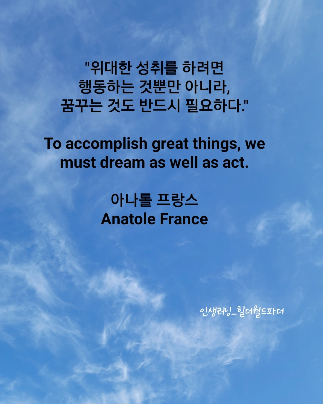 아나톨 프랑스는 행동만 해서는 성취를 이룰 수 없다고 했습니다. 왜 행동하는지 꿈이 있어야 성취한다고 합니다.