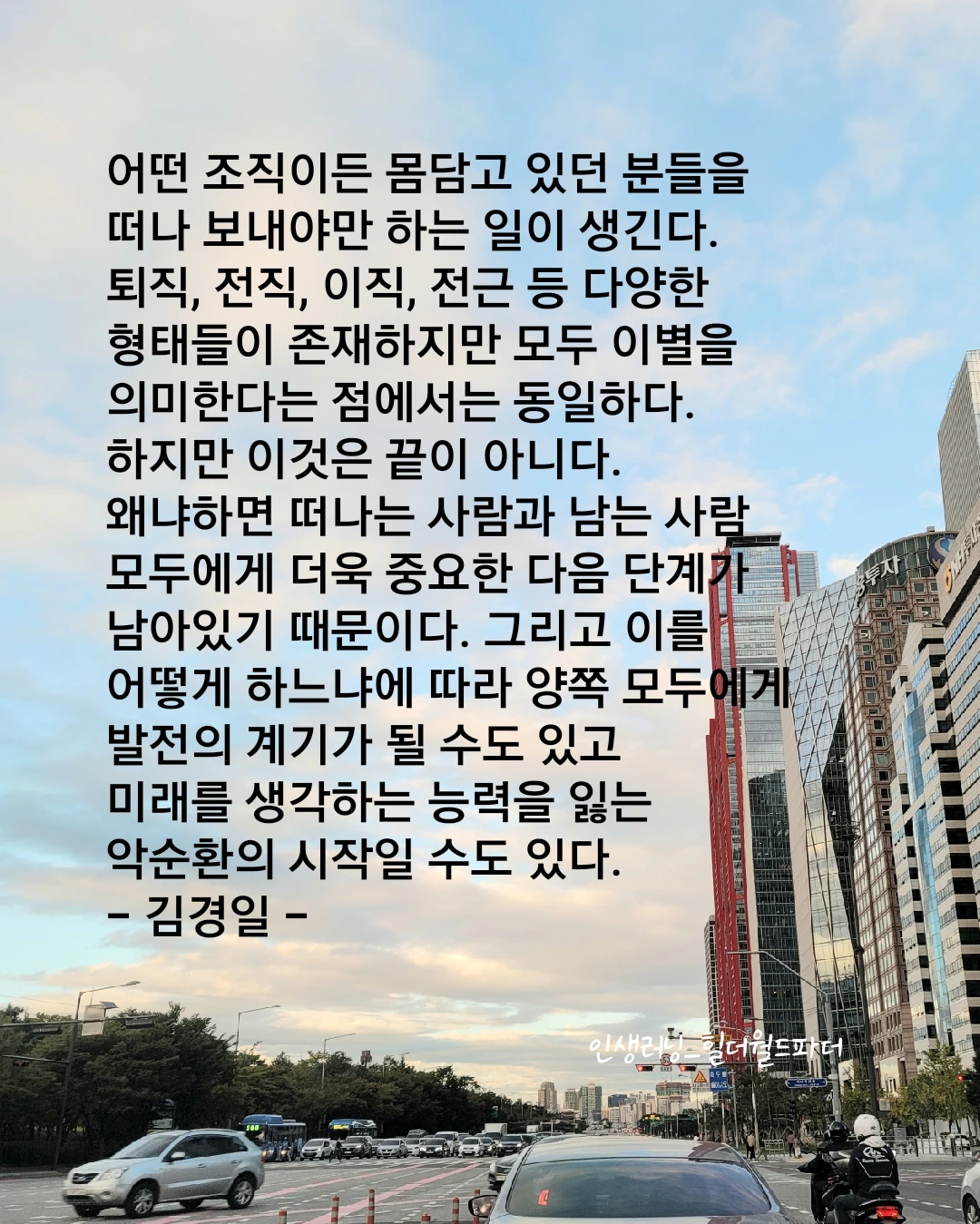 그래야만 떠나는 사람은 보람을, 남은 사람들은 미래에 대한 이정표를 가지게 된다. 단순히 위로나 덕담한다고 좋은 리더가 아니다.