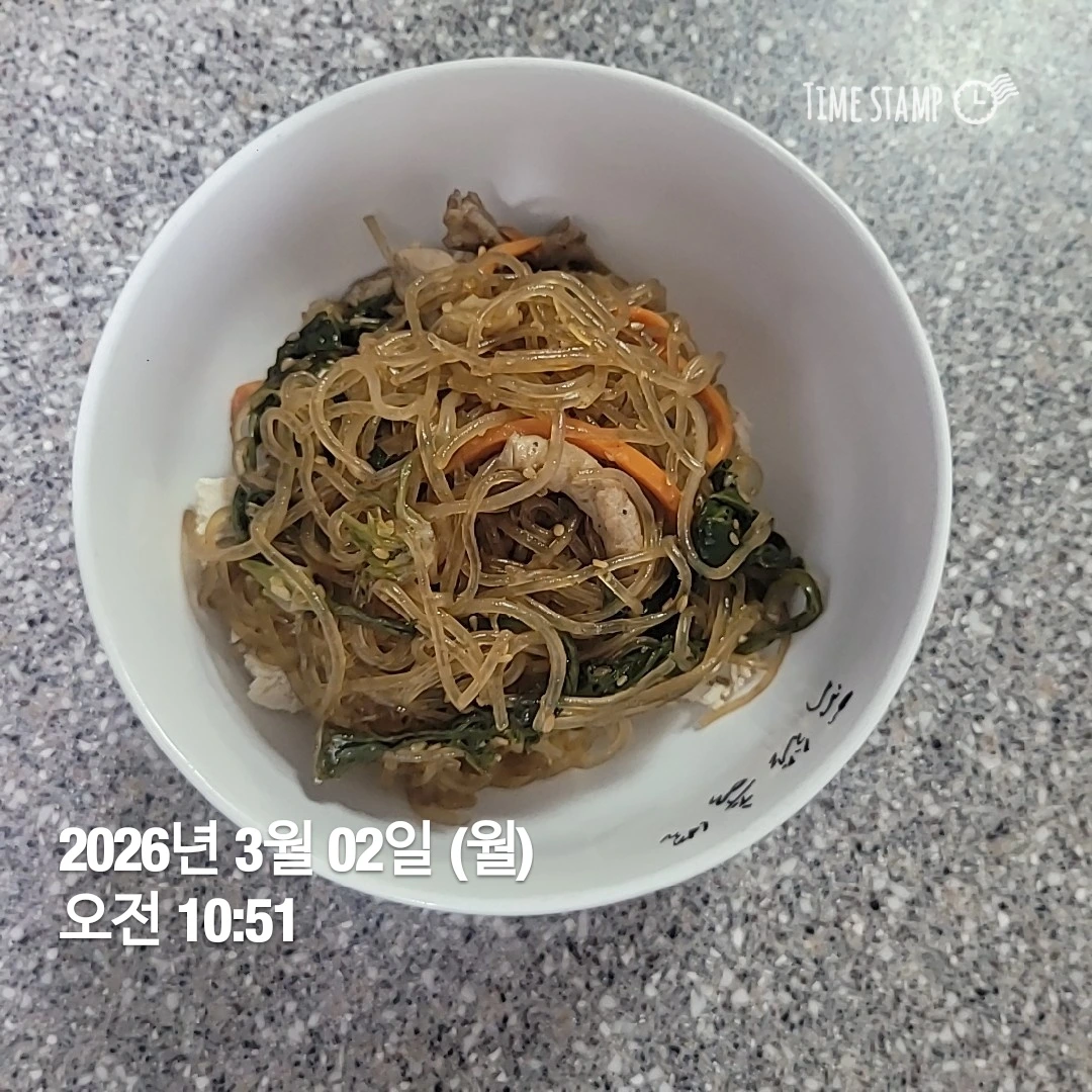 남편이 먹고 있던 잡채에 닭가슴살에 얹어서 해결했다.