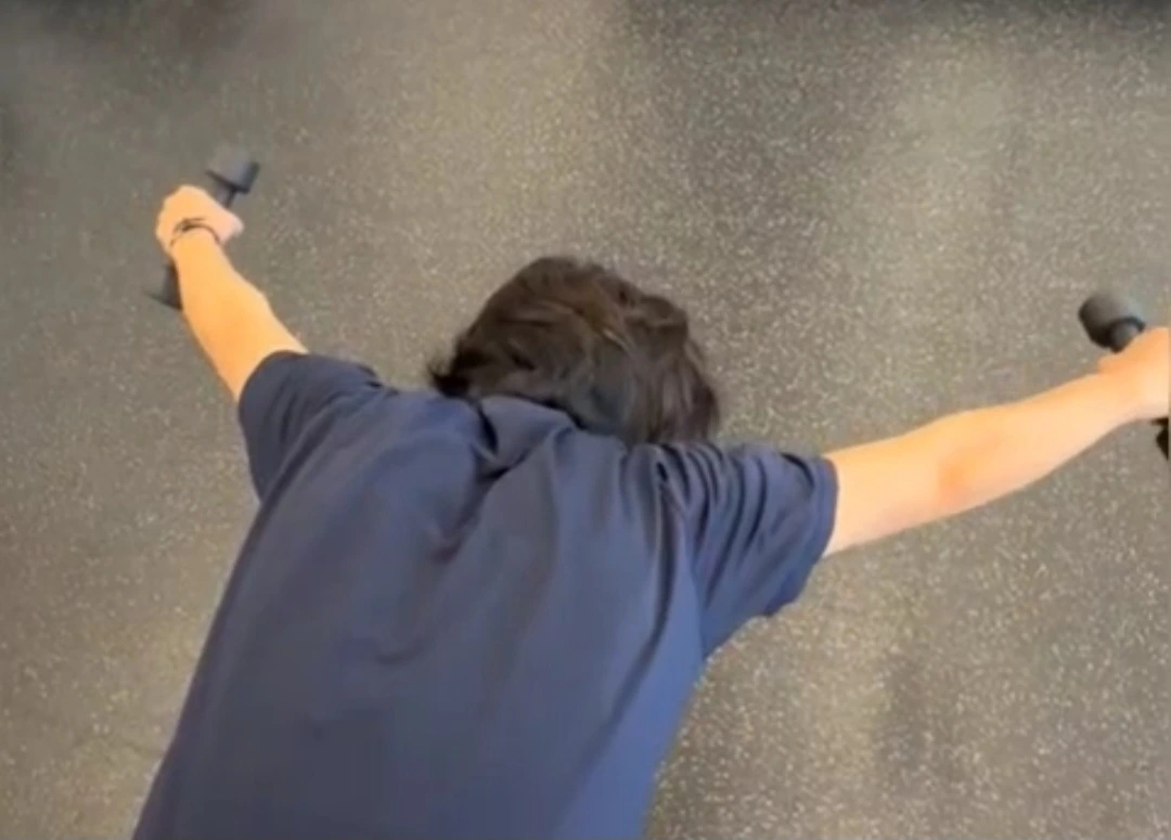 덤벨을 들고 벤트오버 레터럴 레이즈를 하게 됐다.