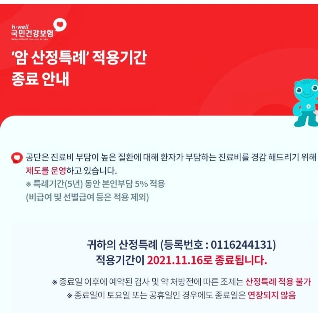 산정특례로 중증으로 진단이 되면 아무리 대학병원일지라도 병원비는 생각보다 많이 나오지 않는다. 실비보험이 있다면 병원비는 해결이 된다.