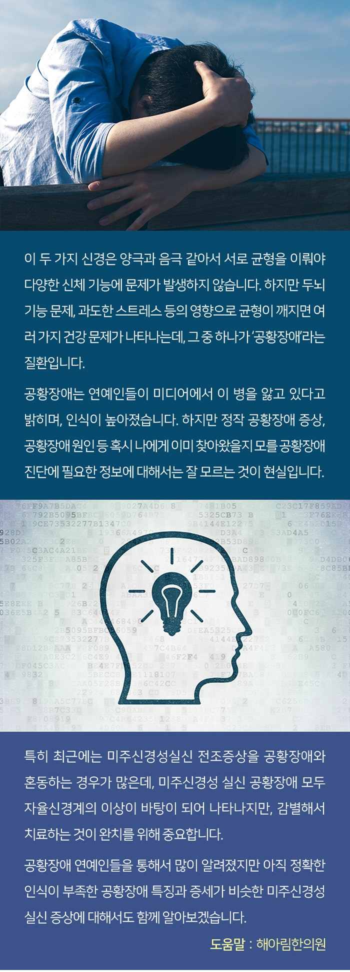 이 두 가지 신경은 양극과 음극 같아서 서로 균형을 이뤄야 다양한 신체 기능에 문제가 발생하지 않습니다. 하지만 두뇌 기능 문제, 과도한 스트레스 등의 영향으로 균형이 깨지면 여러 가지 건강 문제가 나타나는데, 그 중 하나가 ‘공황장애’라는 질환입니다.