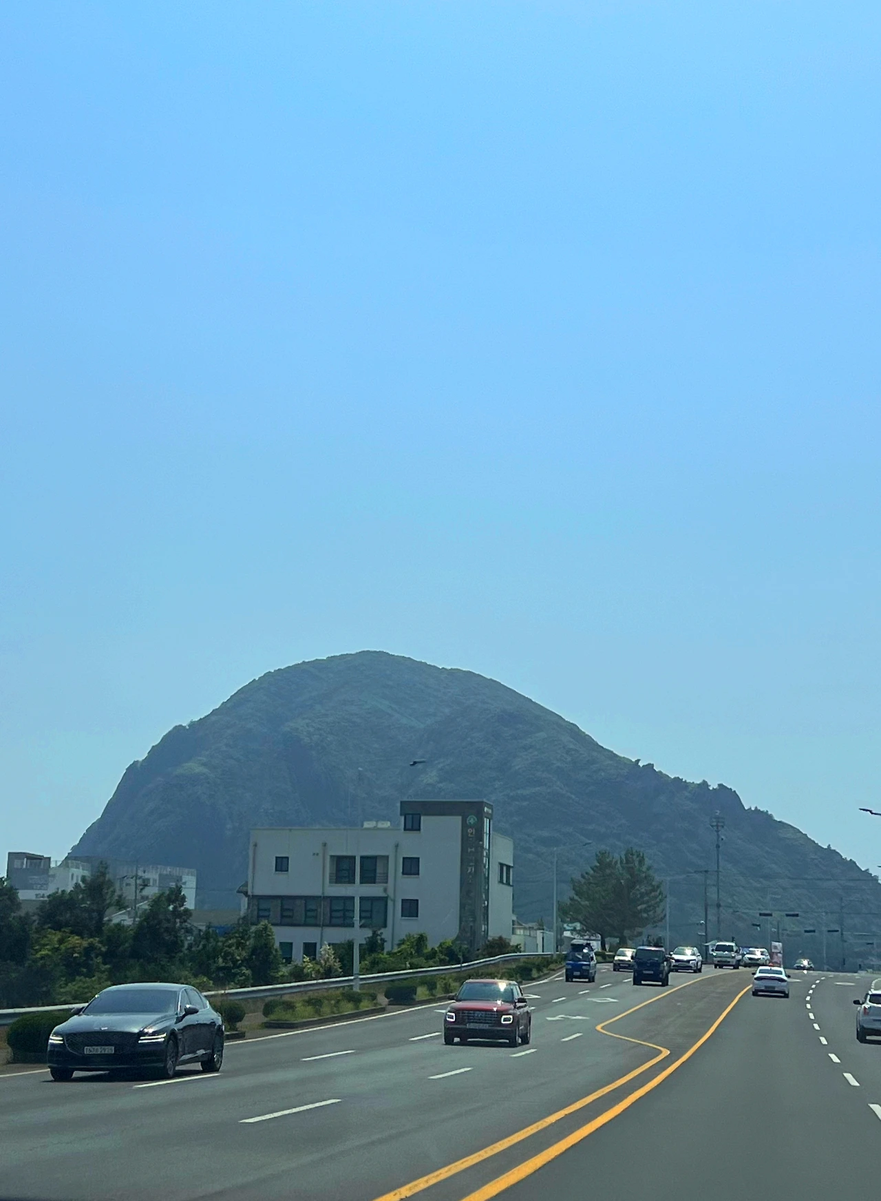 우리가 뛰는 코스는 해변과 맞닿아 있는 평지 길이었다. 뛰는 순간 제주도만의 풍경과 냄새가 코끝을 찔렀다. 도시의 소음에서 벗어나 오롯이 나에게만 집중할 수 있는 시간이 주어졌다. 발소리와 숨소리, 그리고 새소리 외에는 아무것도 들리지 않는 순간들. 이 고요함 속에서 우리는 평소 놓치고 있던 내면의 소리, 혹은 잊고 지냈던 감각들을 다시 일깨울 수 있었다. 아주 짠 바다 향이 났고, 뒤로는 웅장한 산방산이 보였다. 산방산은 가까이서 보면 정말 압도적이다. 중국의 장가계와 비교할 순 없지만, 커다란 종 모양의 독보적인 느낌이 살아있다. 그래서 진시황도 산방산을 두려워했나 보다.