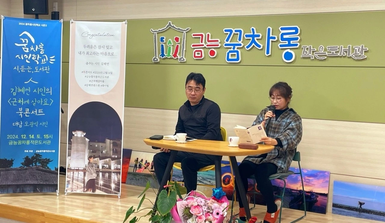 발그레한 얼굴로 앉아있는 시인과, 그 옆에 대담자가 앉아 있었고 첫째 줄에는 시인의 남편이 시집을 훑고 있었다. 나는 아들과 중간쯤에 자리를 잡았다. 시인은 말보다 몸의 리듬이 편한 사람처럼 보였다. 춤을 출 때는 표정도 연기자 급이더니 도서관 무대에 오른 시인은 수줍은 사춘기 소녀 같았다.