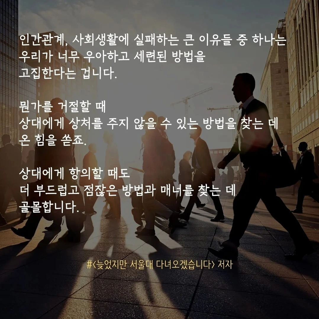 나는 너무 세련되거나 우아한 언행을 고집하는 사람, 자신의 속내를 감추고 의뭉스러운 사람을 별로 좋아하지 않는다. 대부분은 의뭉스러운 사람을 좋아하지 않을 텐데, 세련되고 우아하기만 한 사람도 일종의 '의뭉스러운 사람'에 속한다고 본다. 세련되고 우아한 모습은 그 반대의 모습보다는 보기 좋은 건 사실이고 남을 배려하는 느낌을 주긴 한다. 하지만 너무 심하게 세련과 우아에 치중하다 보면, 어떤 식으로든 자신의 모습을 좋게 보이려고 남을 속이게 된다. 가끔 겉모습이 세련되고 우아해서 좋은 사람인 줄 알았는데, 앞뒤가 다르다거나 내면은 어둡거나 초라한 사람을 목격한 적이 있을 것이다. 세련과 우아도 사람의 가식이나 이중성에서 나올 수 있다고 생각하고 나서는 무조건 사람을 좋게만 보지 않는다. 누군가가 어떠한 이득을 얻으려고 이중성을 드러낼 때의 실망감도 줄어들었다. 어린아이의 천진난만함을 벗어버리기 시작하면서 어른들의 말과 행동에는 가식과 이중성이 내포될 수밖에 없는 현실도 받아들였다. 약간의 세련과 우아를 장착하되, 인간 본연의 감정이나 본질에 충실하고 자신을 가감 없이 드러내는 사람들과 함께 하고 싶다.