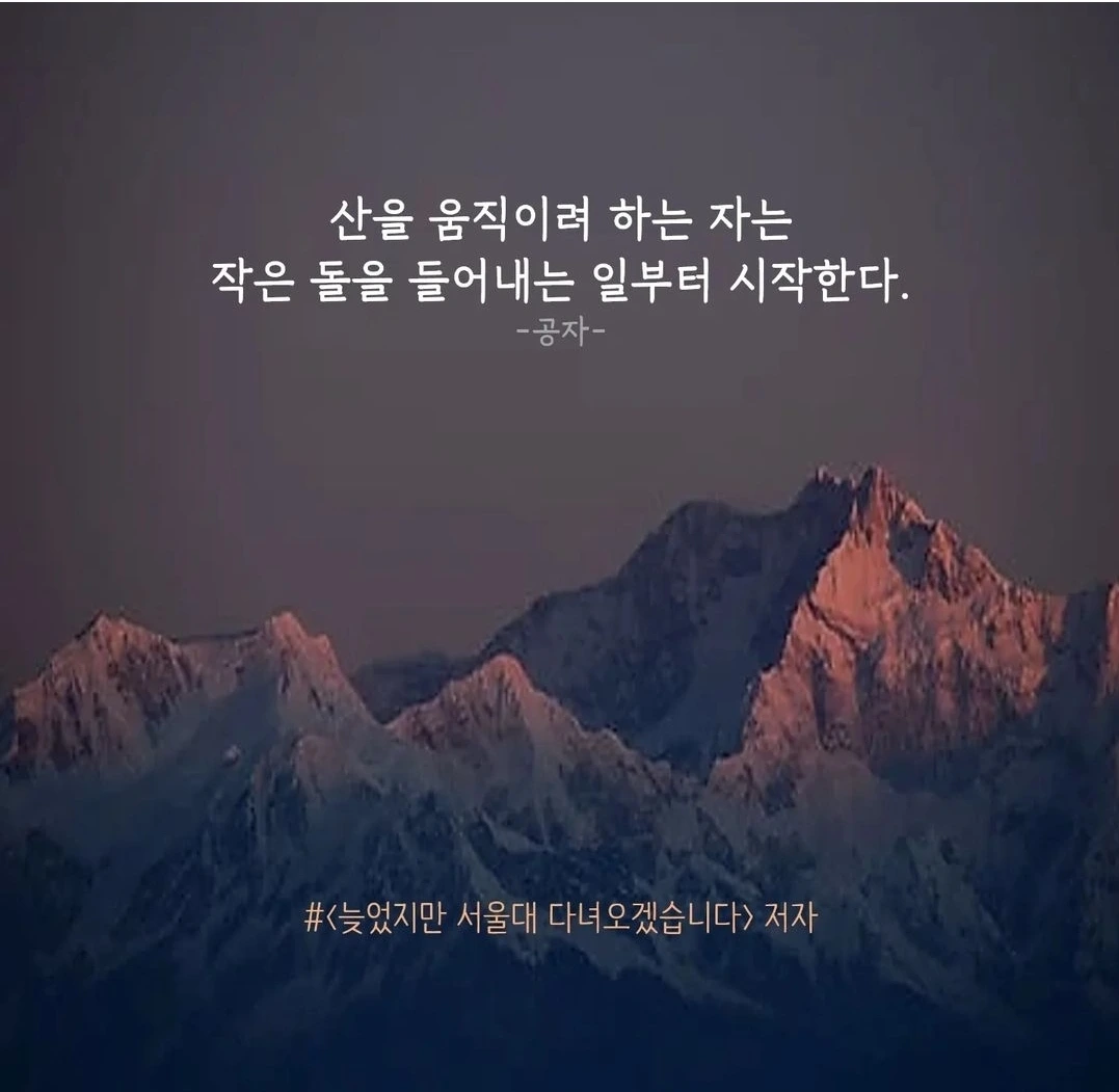 큰 성공은 작은 성취들의 합이다. 인간이 0세에서 시작해서 갑자기 20세가 되려고 아무리 노력해도 1년, 1년을 버텨야 원하는 나이에 도달할 수 있다. 인생사 모든 일의 대부분은 그렇다. 단계를 밟아서 순차적으로 접근해야 일을 그르치지 않고 성과를 얻는다. 티끌 모아 태산이 되려면 10원이라도 아껴서 100원부터 만들어야 한다. 그런데 간혹 작은 성취를 100가지 이루고도 큰 성공 한 번 경험하지 못하는 사람이 있다. 그 작은 성공들이 너무 미미해서 아직 더 많은 작은 성취가 필요한 경우도 있겠지만, 작은 성취에만 너무 골몰한 나머지 큰 그림이나 방향성을 잠시 잊어서이다. 자신이 이루려는 큰 목표를 바라보면서 그에 맞는 작은 경험들이 축적되어야 하는데, 좁은 시야로 소소한 성취에 만족하느라 큰 꿈을 망각해서는 안된다. 결국 작은 성취 하나하나가 디딤돌이 되어서 목적지에 다달을 수 있는 하나의 선으로 연결되어야 한다.