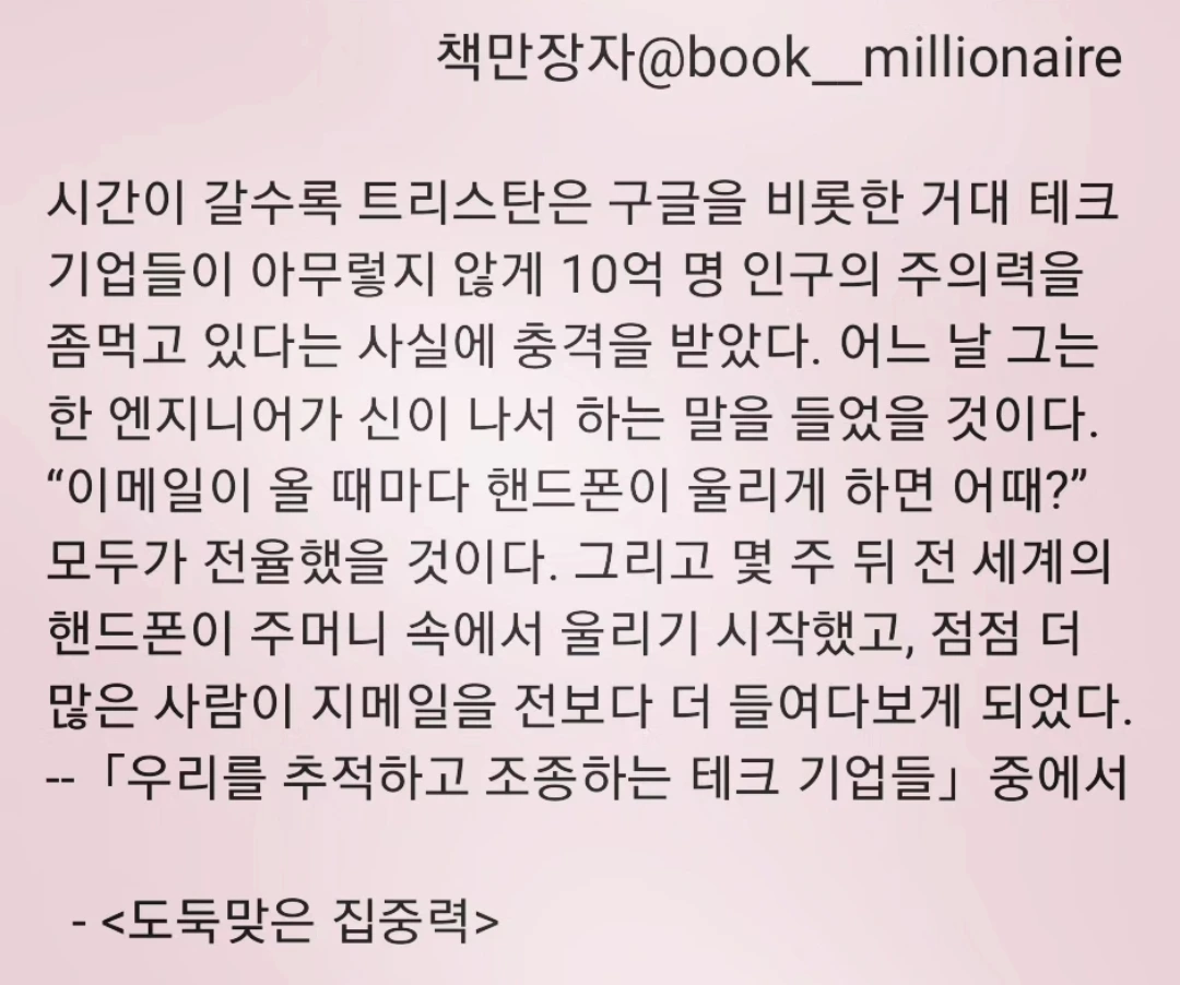 아담에게 저는 말했습니다. “너는 현재에 집중하는 법을 모르는 거 같아. 네 인생을 놓치고 있어! 뭐라도 놓칠까 봐 두려워서 항상 화면을 확인하잖아?” 그에게 큰 소리로 말했지만, 사실은 아담을 향한 분노가 사실은 제 자신에 대한 분노라는 것을 깨달았습니다. 집중하지 못하는 그의 모습, 끊임없이 산만해지는 모습, 그레이스랜드라는 멋진 장소를 아담과 함께 여행하면서도 현실에 제대로 몰두하지 못하는 모습에서 제 자신에 대한 분노가 치밀어 오르는 것을 느꼈습니다. “뭔가 잘못되었다는 걸 알아요.” 아담이 휴대폰을 손에 꼭 쥐고 제게 부드럽게 말했습니다. “하지만 어떻게 고쳐야 할지 모르겠어요.” 그러고는 다시 휴대폰을 잡았습니다. 저는 집중할 수 없는 상황에서 벗어나기 위해 애덤을 데리고 여행하기까지 했지만, 이 문제는 어디에나 있었기 때문에 탈출구가 없다는 것을 알게 되었습니다. 그때 저는 세계 최고의 과학자들로부터 왜 이런 일이 많은 사람들에게 일어나는지, 그리고 결정적으로 어떻게 해결할 수 있는지 이해하기 위한 여정을 떠나야 한다는 것을 깨달았습니다.
