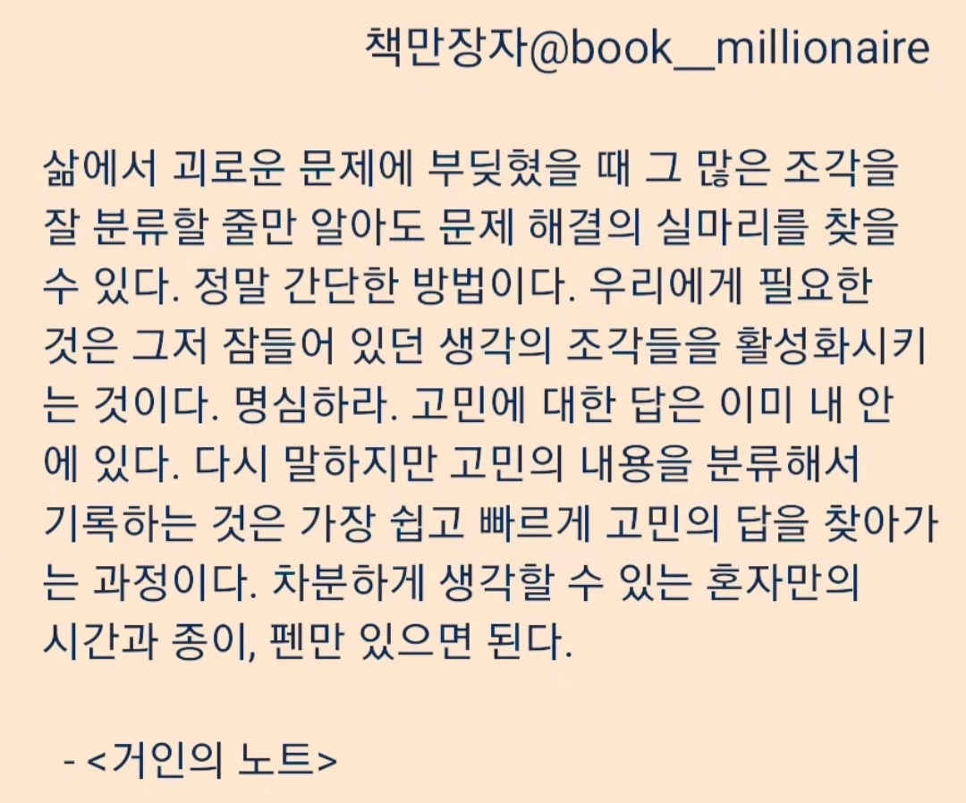어떤 고민이 생겼을 때 끊임없이 외부에서 답을 찾은 적이 있다. 예를 들어, 인생을 어떻게 살아야 의미 있고 가치 있게 살 수 있을지 고민에 빠졌다고 하자. 그러면 자신의 철학과 소신에 맞게 인생을 멋지게 살고 있는 사람들의 책들을 쭉 읽는다. 그리고 더 생생하게 그 사람의 목소리를 듣고 표정과 행동을 살필 수 있는 유튜브를 여러 편 시청한다. 책을 포함한 다양한 매체를 통해서 인생을 잘 사는 방법을 그렇게나 많이 접하고서는 내가 해답을 찾을 수 있었을까. 정답은 '아니요'이다. 왜 그런지 곰곰이 생각해 보니 각 개인에 적합한 인생살이 방정식은 각자에게 따로 있다. 재능, 본성, 적성, 환경, 상황, 운 등등 한 개인에게 주어진 리소스나 조건은 너무나 다양한데, 내 고민의 해답을 밖에서 찾으려고 시도한 것 자체가 이미 성취불가능한 조건을 쫓게 된 것이다. 어쩌면 자신의 내면을 쳐다보기 싫어서 외부에서 답을 찾는 척하고 있을지도 모른다. 내면으로 들어가서 고민의 정확한 실체와 직면하고 고민의 내용이 무엇인지 조각조각 분류해야 한다. 하나의 조각마다 해결책을 강구하고 그 고민을 없애면서 진정으로 나에게 딱 맞는 해답을 찾을 수 있다.