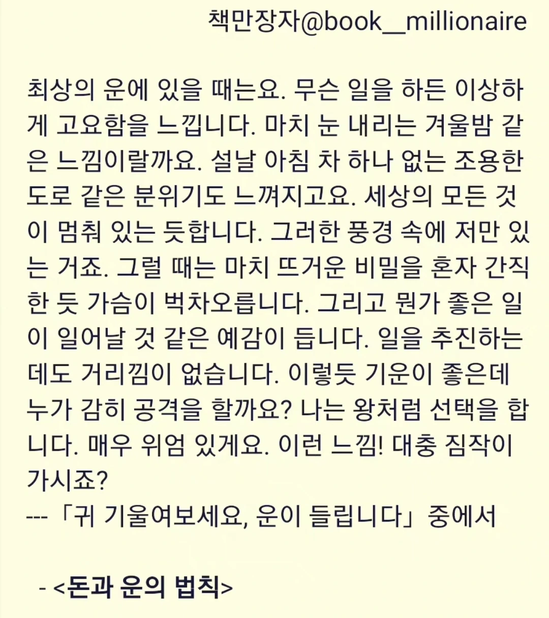 “금수저, 은수저가 아닌 우리네 보통 사람들 중에서 스스로의 힘으로 거부가 된 사람들을 보셨을 겁니다. 그들은요. 하나같이요.‘좋은 구간’을 만났을 때 엄청난 에너지를 발휘해 천장을 뚫었습니다. 그것이 그들이 운을 운용한 방법이에요.”