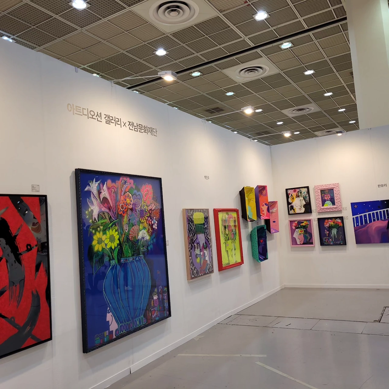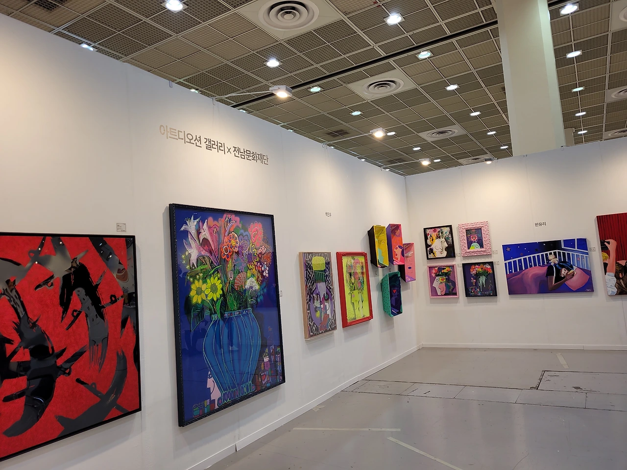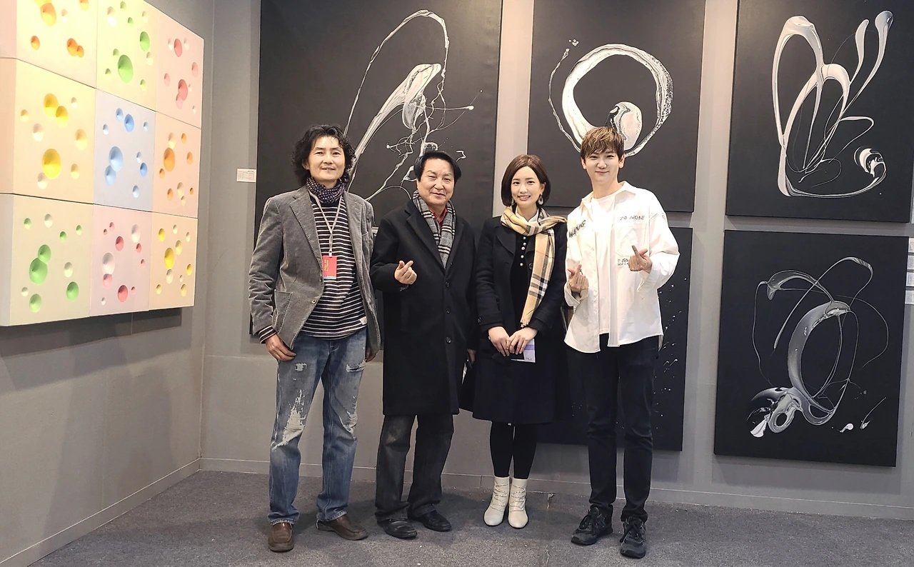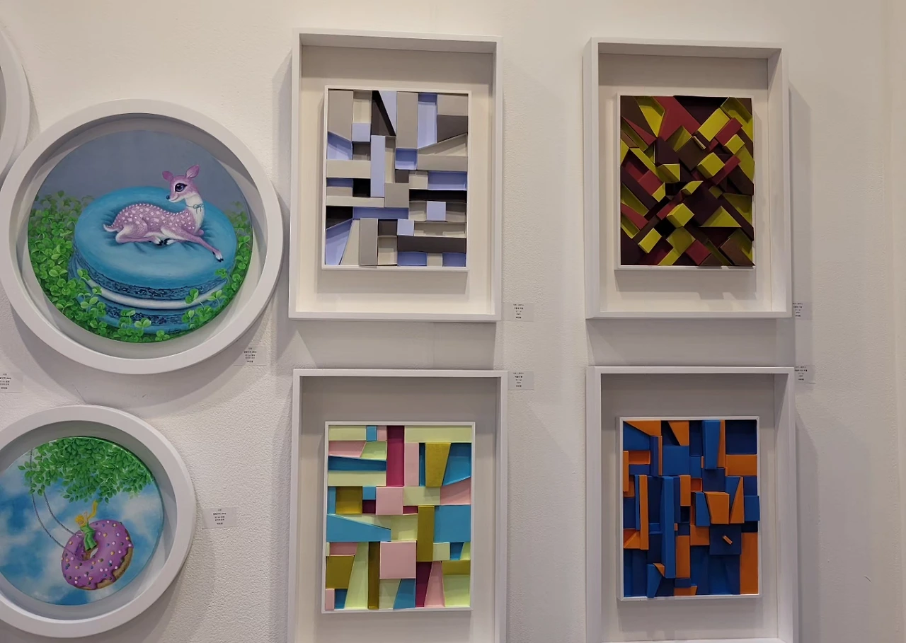 국경오 작가님은 아름답고 서정적인 인물의 자세를 연출하는 작업에 뛰어나신데, <품다>라는 작품에서 남녀의 포옹하는 장면을 나무에 빗대어 표현하여 자연스러운 매력과 서정적인 느낌이 함께 드러났다. 바이올리니스트, 뮤지컬배우, 화가 등 예술 전반에 걸쳐 맹활약 중인 멀티아티스트 KoN은 우주와 의식의 형상을 추상적으로 표현한 작품에 대해 이해하기 쉽게 설명해주었다. 음악적 재능이 미술이라는 새로운 장르 위에 펼쳐진 느낌이 들어서 신선했다. 최지윤 작가님은 꽃과 보석을 소재로 사랑의 서사를 작품에 담아내고 있었고, 세상 사람들에게 사랑을 심어주고 온 세상에 사랑이 가득 찼으면 하는 마음이 실려 있다고 강조하셨다.