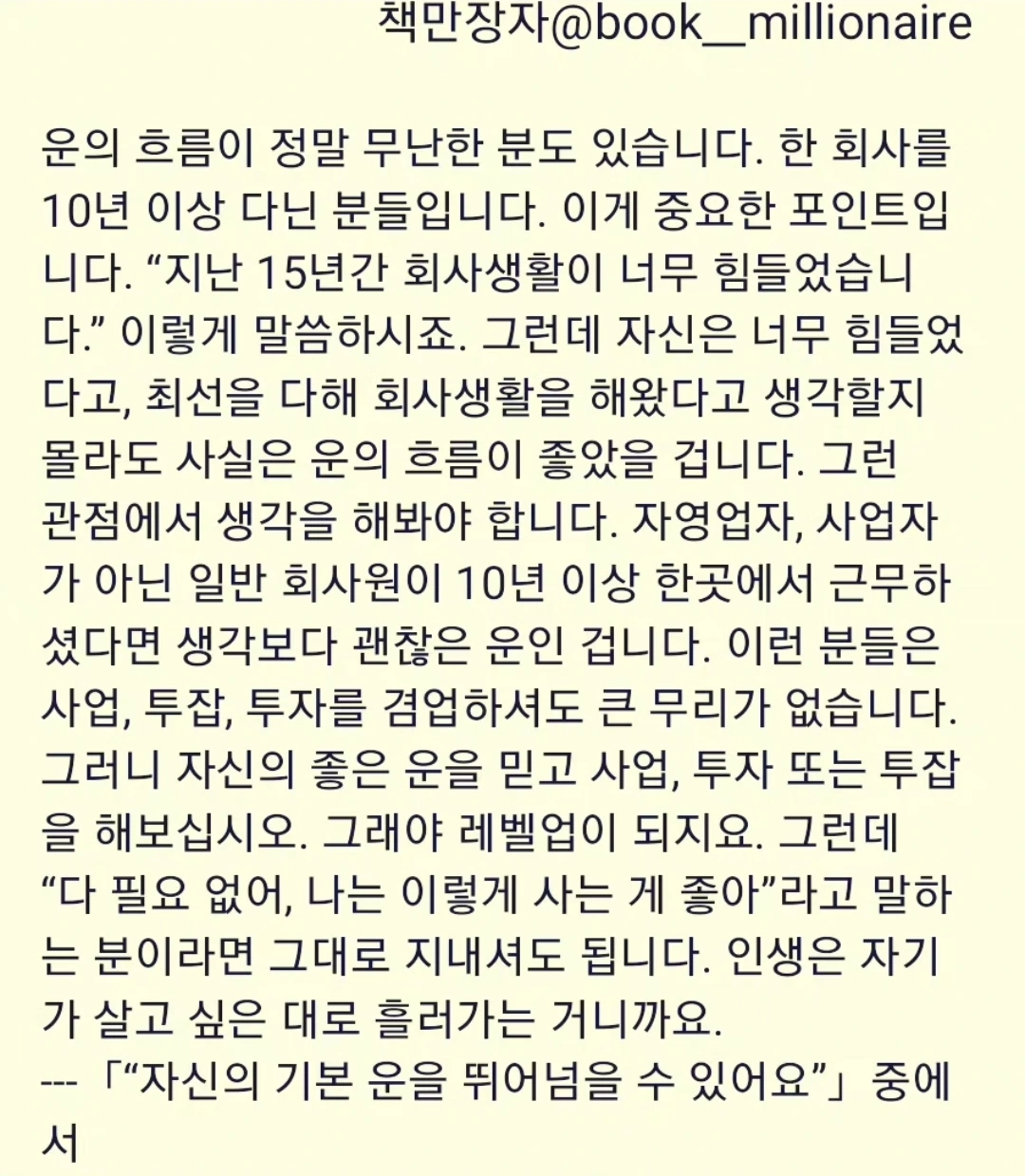 회사를 다니다 보면 이직이나 퇴사욕구가 솟아오를 때가 있다. 회사 다닌 지 1년, 3년, 5년이 가장 큰 고비라고도 하고, 10년 정도 되면 권태기에 접어들기도 한다. 회사생활을 결혼생활과 비교하자면 기대와 설렘을 안고 신혼을 보내다가 부부싸움이 잦아지고, 서로 자포자기하는 권태기가 오다가 이혼 이야기가 오고 가고 그러다가 계속 참고 살면 황혼기가 오듯이 회사도 마찬가지이다. 풋풋한 신입사원으로 시작해서 회사에 잘 적응하는 듯하다가 업무와 인간관계에 문제가 생기면 이직 기회를 엿보다가 잘 안되면 번아웃과 매너리즘 속에서 좀비처럼 회사를 출퇴근하는 지경에 이른다. 그런데 그렇게 10년이 지난 후 자신의 과거를 돌아보고 주번 사림들을 살펴보니 "그래도 이혼 안 하길 잘했다!", "그래도 회사에 붙어있길 잘했다!"는 생각이 들기도 한다. 어쩌면 10년 이상 회사에서 버티게 해 준 일도 하늘의 뜻이려니, 경기침체가 계속되는데 일자리가 있어서 다행이라는 감사함도 생긴다. 10년 이상 회사를 다니면서 어떠한 우여곡절이 있었다고 해도 그 또한 무난한 운의 흐름을 탄 것이라는 말도 일리가 있다.