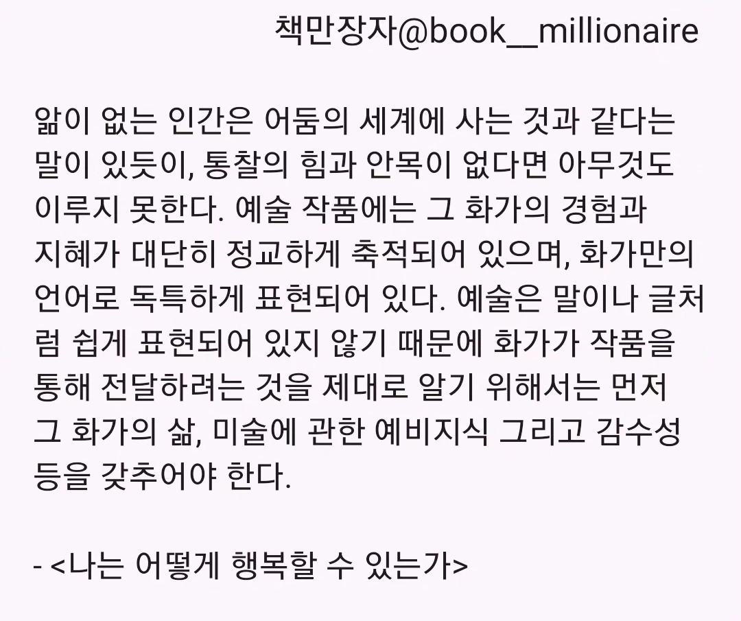 3. 예술작품의 제목을 통해 의미를 파악해 보기 작품의 제목에는 작가가 작품에 담고 있는 의미가 드러나 있습니다. 특히나 추상작품의 경우에는 작품의 제목을 통해, 작가가 작품에 담고자 한 주제를 파악할 수 있습니다. 작품의 제목을 통해 대략적으로 작품이 담고 있는 내용을 파악했다면, 작품에 사용된 요소 하나하나를 따져보는 것이죠. 예를 들어 제목이 올빼미라면, 올빼미를 표현하는 데에 왜 이 색상을 사용한 것일까? 올빼미를 담고자 하면서 왜 이렇게 밝은 색상을 사용한 것일까? 올빼미는 지혜를 상징하는 데 이 색상 혹은 이 도형과 지혜는 어떤 연관성이 있는 것일까? 를 생각해 보는 것이죠. 그러나 분명 해석이 잘 되지는 않을 것입니다. 그렇기 때문에 위에서 소개를 해드린 방법을 활용하는 것이죠. 누가 이 작품을 창작했을까? 이 작가는 언제 어디에서 이 작품을 창작했을까? 이 작가는 왜 이 작품을 창작하게 되었을까? 이 작가는 이 작품을 어떻게 창작하게 되었을까?를 찾아보는 것이죠. 미술관에 오기 전에 간단하게 작가에 대해 찾아보는 것이 도움이 되는 이유가 바로 여기에 있습니다.
