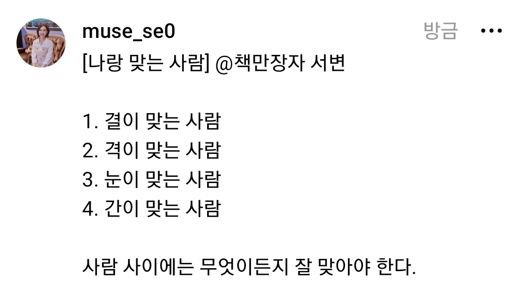 [나랑 맞는 사람] @책만장자 서변 1. 결이 맞는 사람 2. 격이 맞는 사람 3. 눈이 맞는 사람 4. 간이 맞는 사람 사람 사이에는 무엇이든지 잘 맞아야 한다.