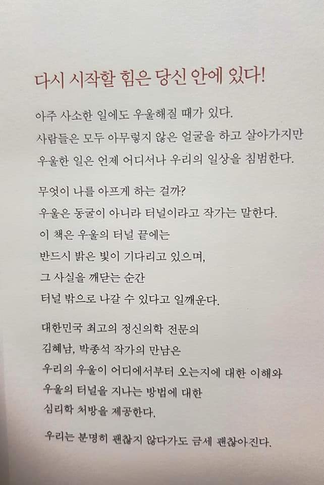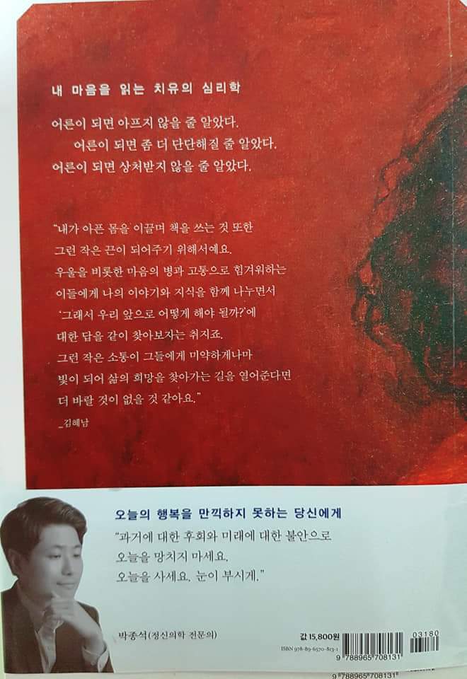 여느 심리학책 보다 전문적인 지식과 정신과 상담 사례를 통해 심도있고 현실적인 이야기를 들려 주셔서 시간가는 줄 모르고 책을 읽었다. 마음의 고통과 치유에 관한 책을 읽을 때마다, 작은 성취감을 느낄 수 있는 시간을 통해서 하루하루를 생생하게 살아 가고, 충전된 마음에너지로 행복하고 만족스러운 자신만의 삶을 만들어가는 여정이 참으로 소중하다는 생각을 한다. 자신을 사랑하고 자신의 삶에 애정을 느끼라는 그 상투적인 조언을 실현시키는 일이 참 의미있다는 걸 또 한번 깨우친다.