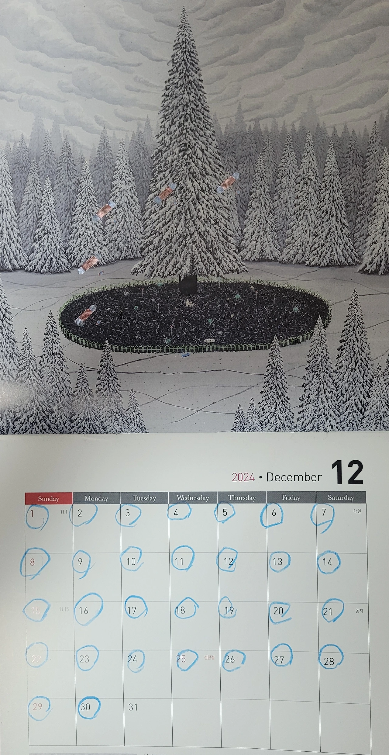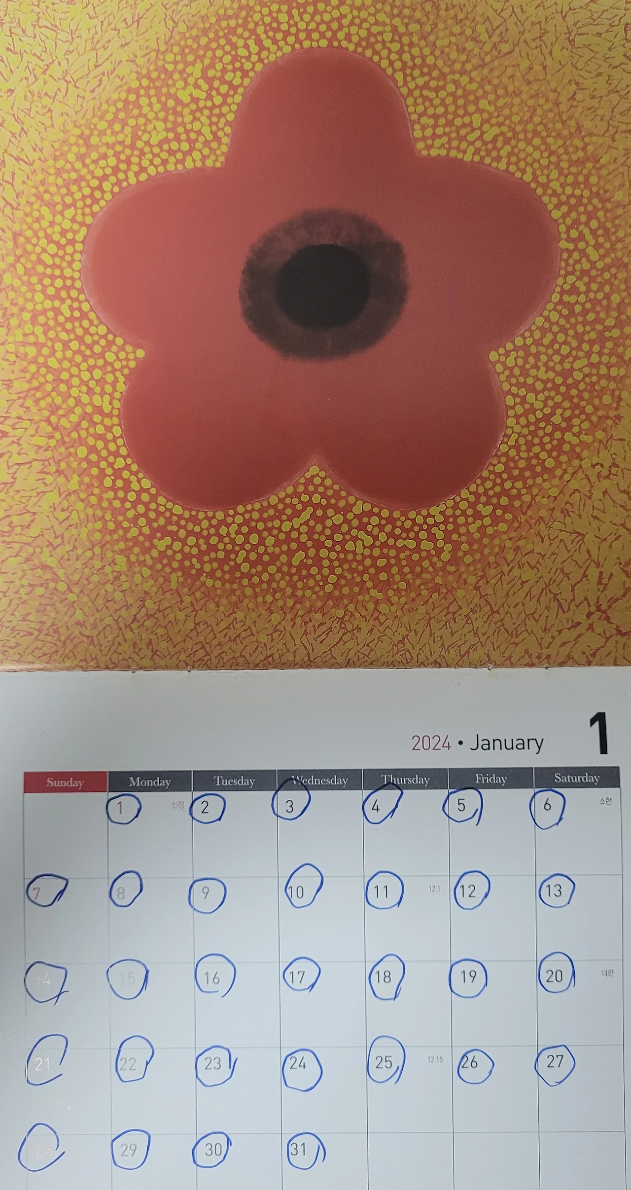 그리고 올해 나에게 꽉 찬 시간은 얼마였고, 텅 빈 시간은 얼마였나를 되돌아본다. 예전에는 새해만 되면 투두리스트, 비전보드, 생활계획표 같은 거창한 뭔가를 만들었었는데, 어차피 하다 보니 계획대로 살지 않게 되더라. 그냥 흘러가는 대로 사는 게 마음도 편하고 나에게 더 맞는 방식인 것 같아서 과감히 버렸다. 그래서 2024년에는 특별히 1월 1일부터 스스로 '하루 성찰 프로젝트'를 진행해 봤다. 그리 대단한 건 아니고 아주 단순한 프로젝트로서 어제 잘한 일, 행복했던 일, 감사한 일을 10초 정도 떠올리면서 달력에 동그라미를 치는 것이다. 어제의 기억이 희미하게 사라지거나 정신없이 시간이 흘러가는 와중에 10초 정도의 시간을 투자해서 '하루 성찰'을 하니 그래도 하루하루를 의미 있게 살고 있다는 위안도 되고 삶의 루틴도 정돈이 되었다. 어제를 떠올리면서 기억력도 좀 살아나는 느낌이라 치매 예방에도 좋지 않을까.