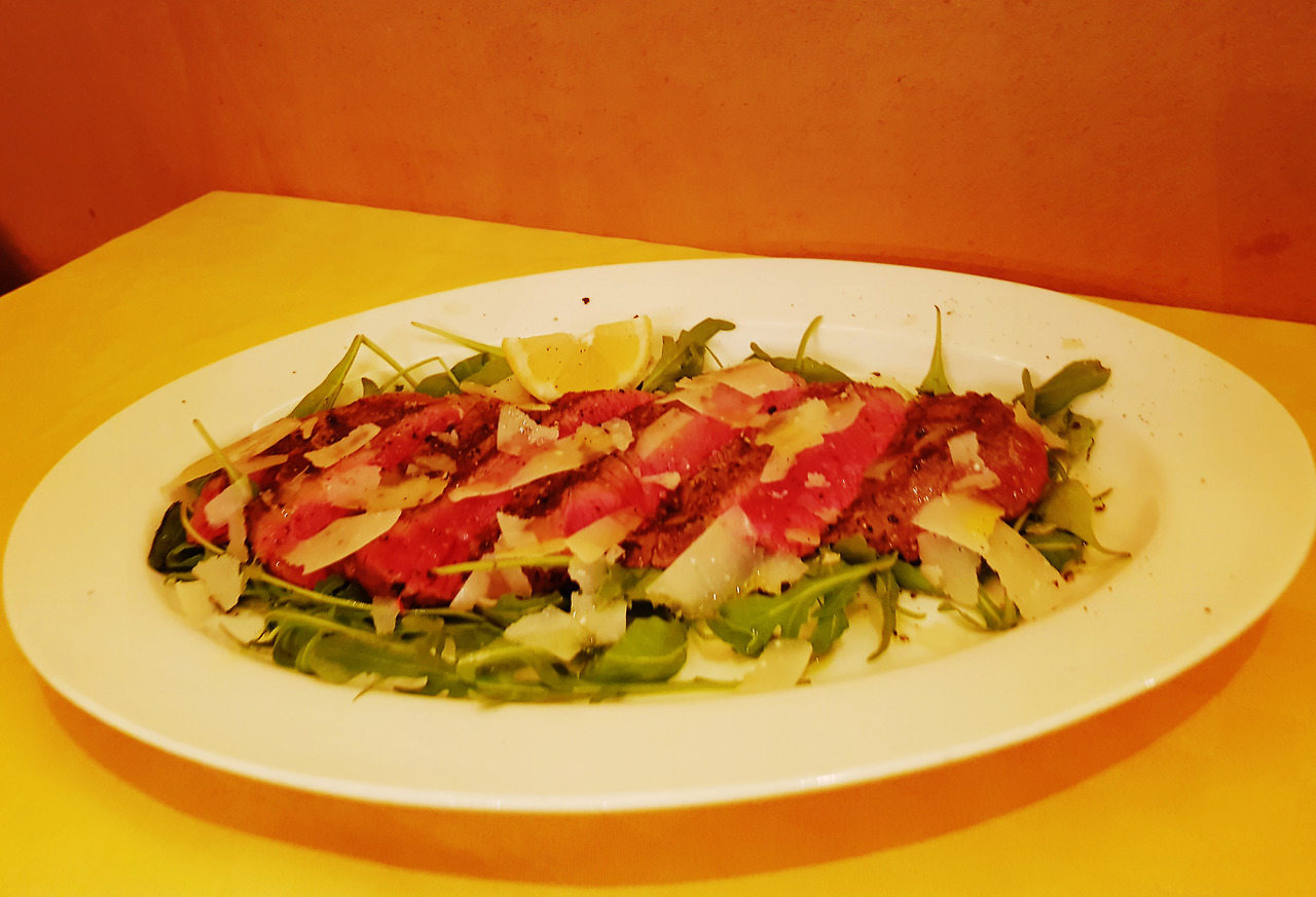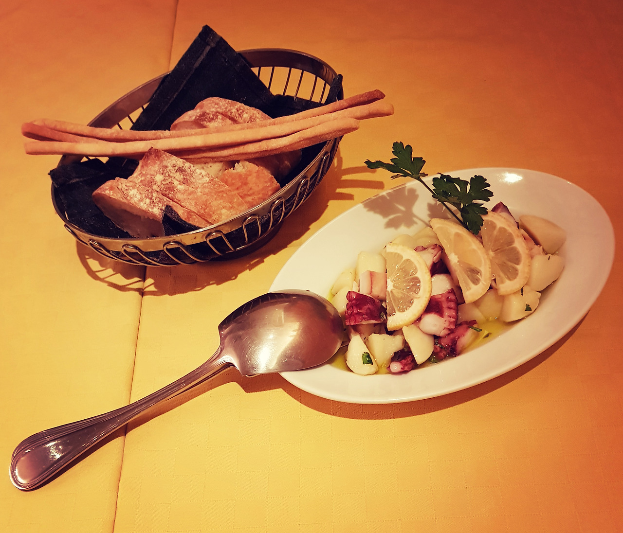 메뉴는 Antipasti(전채 요리) Primi(파스타) Secondi(메인) Contorni(사이드디쉬) Dolce(디저트)로 구성되어 있다. 전채요리로 주문한 문어감자샐러드는 부드러운 문어와 삶은 감자에 올리브유를 곁들였고, 레몬과 파슬리로 향을 내어 새콤달콤 하면서도 전체적으로 폭신폭신한 식감이었다. 식전빵인 바게뜨와 브레드 스틱을 샐러드에 찍어 먹어도 제격이다.