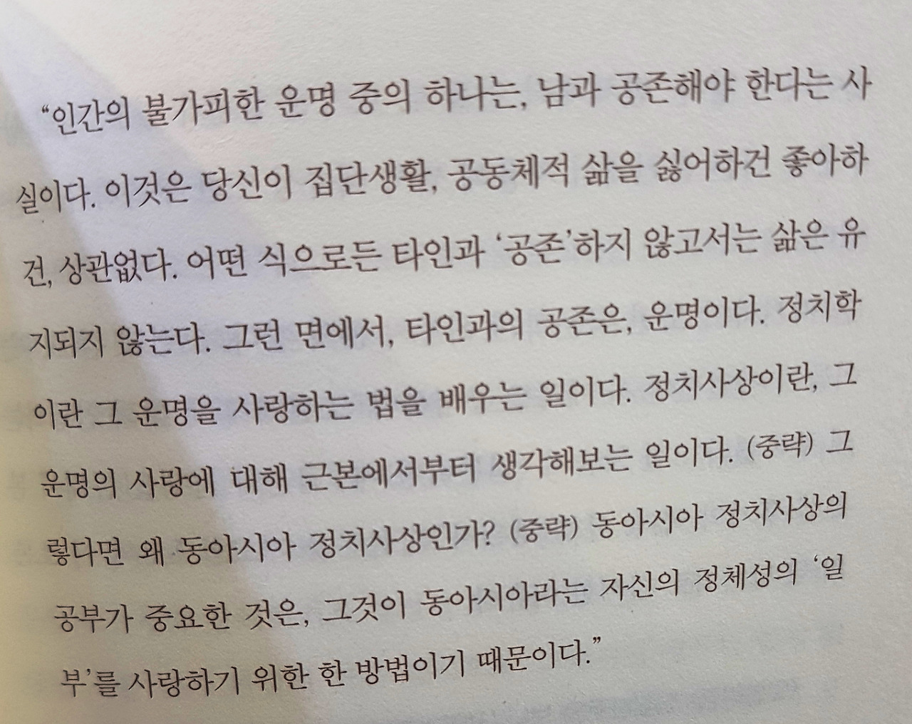 -정치사상은 철학과 정치학을 매개하는 학문 분야다. 철학자는 추상적인 사고를 하는 경향이 있다. 정치학은 굉장히 경험적인 세계, 지금 신문지상에 오르내리는 세계에 치중한다. 정치사상을 연구하면 현실을 바라보면서 상당히 추상적인 생각도 해볼 수 있다(p326).
