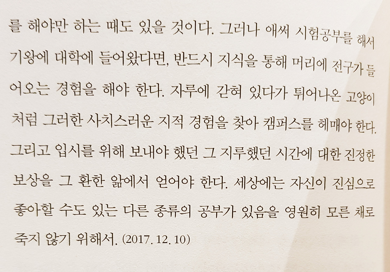 -더 큰 문제는 그 싫어진 공부가 곧 공부의 전부라고 착각하게 되는 것이다. 대학 진학이라는 목표에 고교 시절을 갈아 넣은 뒤, 대학에 들어오자마자 취업을 대비하라는 사회의 명령을 듣는다. 그리하여 취업이라는 목표에 대학 시절마저 갈아 넣고 나면, 시험을 위한 수단이 아닌 또 다른 종류의 공부가 존재한다는 것도 모르고 나머지 생을 살게 될 수도 있다. 자신은 공부라면 다 지긋지긋하게 싫어하는 사람이라고 믿으면서(p75).