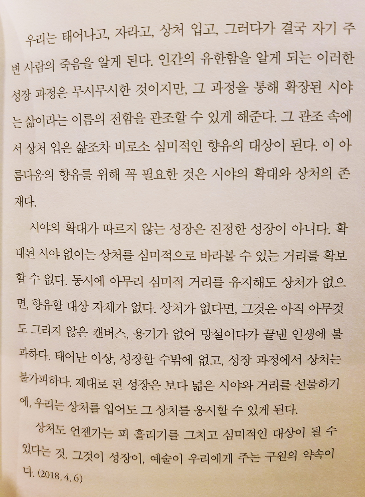-태어남과 동시에 우리는 시간의 강물 속으로 던져진다. 그리고 시간이 흐르며 몸이 자라고 마음이 영글어간다. 흔히 '성장'이라고 부르는 이 사태는 도대체 무엇을 의미하는 것일까? 먼저, 성장한다는 것은 주변과 자신의 비율이 변화하는 것이다. 성장은 익숙하지만 이제는 지나치게 작아져버린 세계를 떠나는 여행일 수밖에 없다. 예상치 못했던 어느 순간, 사랑하거나 미워했던 이의 부고를 듣는다. 이 부고 역시 우리의 시야를 확장시킨다(p35).