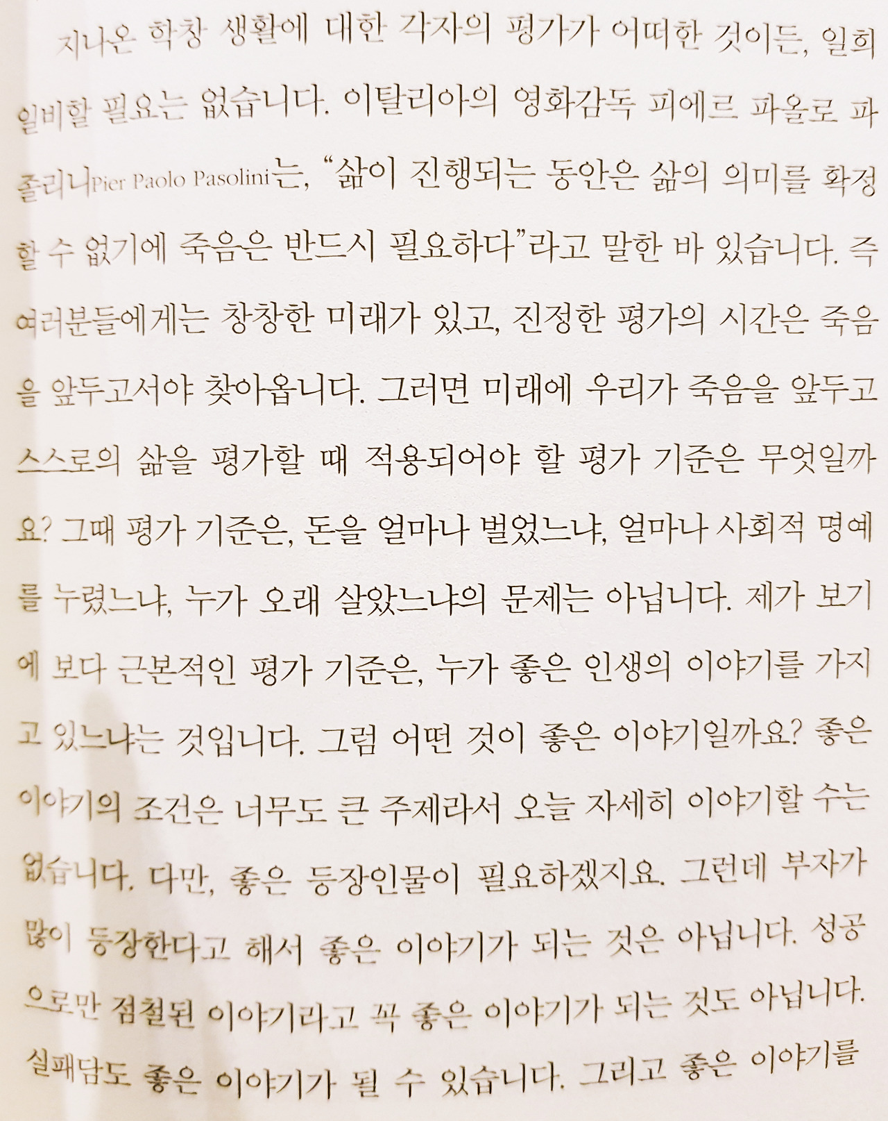 -대학 간판 말고는 딱히 자존감을 얻을 거리가 없는 인생을 살아갈 사람에게는 수능 성적이야말로 자기 인생의 결정적 지표일지 모른다. 그러나 미래를 향해 활보해나갈 사람들에게 대학 입시는 지나가는 에피소드에 불과하다. 그 에피소드를 위해 온통 수단화된 공부만 하라고 다그치는 분위기 속에서 고교시절을 보내야만 하는 청소년은 불행하다(p74).