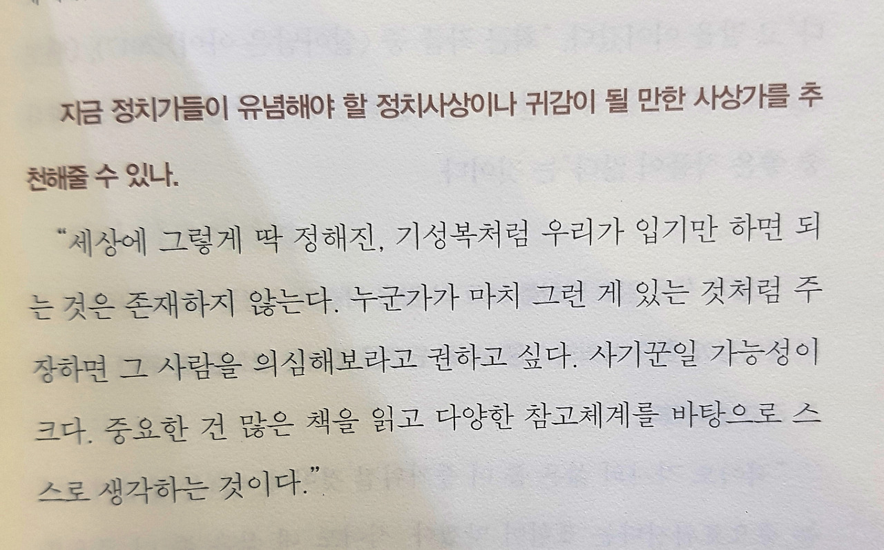 -자신 있고 겸소한 학자보다 자신 없고 무례한 학자가 많은 것이 대학 사회입니다. 인기 교수나 정치교수는 예외 없이 허학자들입니다. 자신에 대한 믿음은 역사의식에서 나옵니다. 젊은 교수들이 주류에 서서 쉽게 인정받기보다는 역사의식을 가지고 비주류에 서서 자기 자신의 고유한 길을 완강하게 걸어 나가기 바랍니다(p136) .