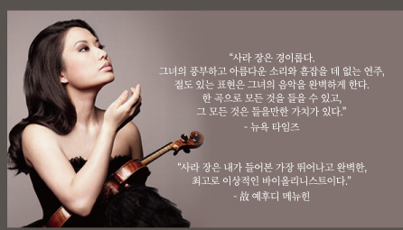 2012년 이후 7년 만에 한국에서 독주회를 가지는 바이올리니스트 사라장(장영주). 그녀는 한국이 낳은 천재 음악가의 대명사로, 만 8세의 어린 나이에 뉴욕필 협연으로 세계 무대에 데뷔한 이후 EMI와 계약하면서 세계 최연소 레코딩 기록을 보유한 천재 뮤지션이기도 하다. 2006년 뉴스위크 매거진에서 '리더십이 강한 20인의 여성'으로 선정된 바 있고, 사회적 성취와 활동을 인정받아 2008년에는 세계경제포럼(WEF) 선정의 영 글로벌 리더로 뽑혔다. 2005년 예일대학교에서 스프라그 홀에 사라장의 이름을 딴 객석을 마련했으며, 2012년에는 하버드 대학교로부터 '뛰어난 예술 리더십상'을 수상했다.