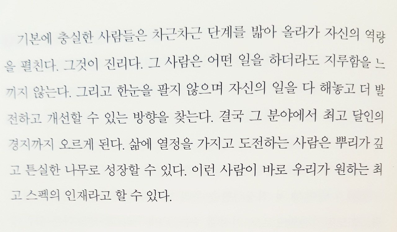 -우리 속담에 '한 우물을 파라'는 말이 있다. 이 말이 기업에도 상당히 중요한데, 바로 전문성을 획득해야 성공이라는 샘물을 맛볼 수 있기 때문이다(p96).