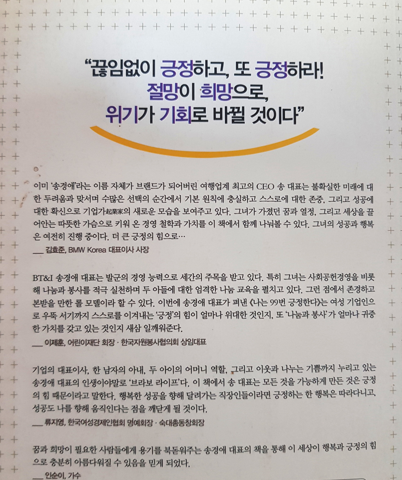BT&I 송경애 대표는 발군의 경영 능력으로 세간의 주목을 받고 있다. 특히 그녀는 사회공헌 경영을 비롯해 나눔과 봉사를 적극 실천하며 두 아들에 대한 엄격한 나눔 교육을 펼치고 있다. 그런 점에서 존경하고 본받을 만한 롤모델이라 할 수 있다. 이번에 송경애 대표가 펴낸《나는 99번 긍정한다》는 여성 기업인으로 우뚝 서기까지 스스로를 이겨내는 ‘긍정’의 힘이 얼마나 위대한 것인지, 또 ‘나눔과 봉사’가 얼마나 귀중한 가치를 갖고 있는 것인지 새삼 일깨워준다. -이제훈, 어린이재단 회장·한국자원봉사협의회 상임대표