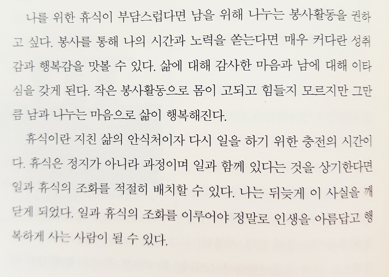 [좋은 문장들] -나눔에 대해 큰일부터 해야 된다고 생각해선 안 된다. 작은 것부터 시작하는 것이다. 그러려면 연습이 필요하다. 내가 회사에서 나눔을 강조하는 것은 어려운 이들을 돕자는 의도도 있지만 나눔의 즐거움을 느끼고, 그래서 행복해지는 법을 알려주고 싶은 마음에서였다(p34).