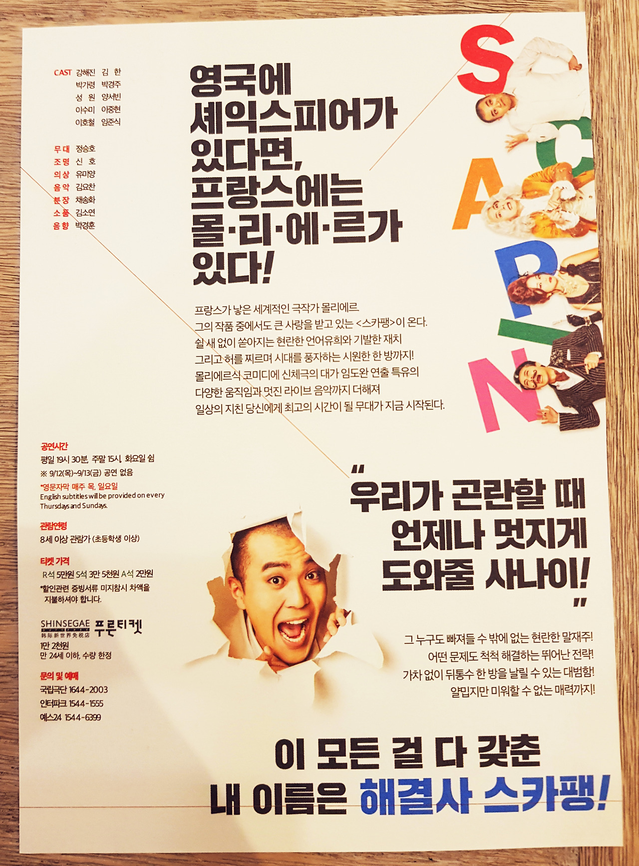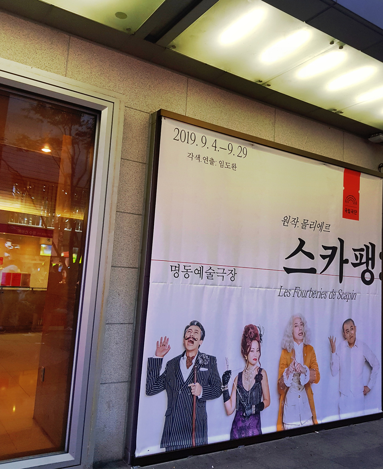 2019년 명동예술극장에서는 사회적 이슈를 담아내는 신작을 많이 선보이는데, 17세기 프랑스의 천재 희극작가였던 몰리에르의 작품인 <스카팽의 간계>는 하층민의 양식있는 시선을 통해 지배 계층의 탐욕과 편견을 조롱하는 내용이며, 이번 공연에서는 <스카팽>이라는 공연명으로 임도완님께서 연출하셨다.