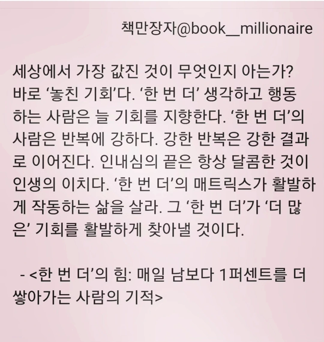 어떠한 일을 하다가 적절한 시기에 우연히 기회를 잡게 되는 경우가 있다. 우연은 우연이 아니고 기회를 잡기 위해서 한 번 더 해보려는 자세를 바탕으로 한 필연의 결과일지도 모른다. 운이 작용하는 영역에서는 한 번 더 노력하지 않아도 자연스럽게 절호의 기회를 놓치지 않고 좋은 결과로 이어지기도 한다. 하지만 일반적인 경우에는 도전의 횟수와 아웃풋의 수준은 비례한다. 이번 아시안게임 배드민턴 여자 단체전에서 금메달을 딴 한국 선수들의 모습을 보고 '한 번 더'가 더 많은 기회로 이어지는 장면을 많이 보았다. 양 팀 선수들이 상대의 코트로 셔틀콕을 쳐서 넘기면서 랠리를 하다가 스매시를 하고 실패하더라도 또 다시 스매시 공격을 해서 셔틀콕이 상대의 땅에 떨어지면 포인트가 끝나게 된다. 스매시를 한 번 시도했다가 포인트를 따지 못했다고 해서 공격을 포기한다면 셔틀콕이 자신의 코트 안에 떨어지게 될 것이다. 공격을 해서 상대방 코트 바깥쪽에 떨어져서 실점하게 되더라도 끝까지 득점의 기회를 엿보려고 해야한다. 한 번 더 쳐서 셔틀콕을 넘기려는 행위가 있어야 포인트로 이어지듯이 무언가 계속 시도해야 결국 행운의 여신을 자신의 편으로 만들 수 있다. 인생에서 금메달리스트가 되려면 강한 반복으로 강한 결과를 만들어야 한다.