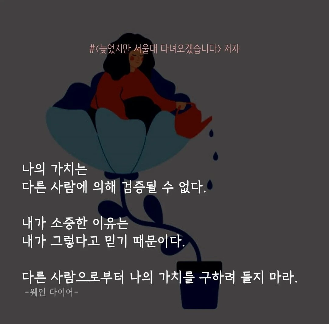 나의 가치를 누군가가 결정하도록 내버려둔 적이 있다. 선생님께서 내가 공부를 잘한다고 하면 나는 모범생인 아이, 부모님께서 내가 착하고 성실한 딸이라고 하면 나는 착한 아이, 친구들이 내가 밝고 긍정적인 사람이라고 하면 나는 밝은 아이로 규정짓곤 했다. 다른 사람의 평가와 판단을 그대로 수용하면서 내가 이러이러한 사람이라고 생각했었다. 물론 타인의 시선이 객관적이고 정확할 수도 있지만 그 사람들이 검증한 나의 가치가 전부는 아니다. 내가 공부를 못할 수도 있고 착하지 않을 수도 있고 긍정적이지 않을 수도 있다. 일부 그런 특성이 있더라도 다른 성향도 분명히 가지고 있다. 내가 가진 잠재력이나 가능성 또한 남들이 생각하는 것보다 클 수도 있고 작을 수도 있다. 나라는 존재에 대해서는 그 누구보다 내가 제일 잘 안다. 나의 가치를 내가 소중하게 여기고 내 스스로를 믿을 때 내 삶의 최대치를 경험하게 될 것이다. by 책만장자 서변