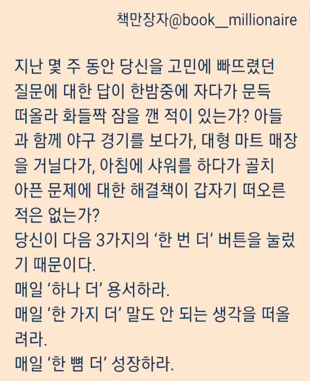 잠이 오지 않을 만큼 근심과 걱정에 사로잡혀서 머릿속이 복잡해진 적이 있을 것이다. 너무 머리가 아프거나 마음이 괴로울 때는 하나 더 용서하거나 한 뼘 더 성장하려는 생각조차 나지 않을 때가 있다. 이럴 때에는 무작정 긍정적인 방향으로 변하려고 안간힘을 쓰기보다는 먼저 뇌를 안정시키는 것이 최우선이 되어야 한다. 산책을 한다든지 음악을 들으며 명상을 한다든지 운동을 하면서 땀을 흘리는 등 신체적인 활동을 통해 먼저 물리적으로 몸의 기와 혈액을 순환시켜야 '생각하거나 느끼는 뇌'를 만들 수 있다. 그런 다음에 '한 번 더'라는 훈련을 해보면 된다. 조용히 뇌를 안정시킨 후 자신이 이룰 수 있는 말도 안 되는 생각을 떠올리거나 한 명이라도 더 용서하고 이해하려고 해 본다. 그러면 한 뼘 더 성장한 자신을 발견하게 될 것이다. by 책만장자 서변