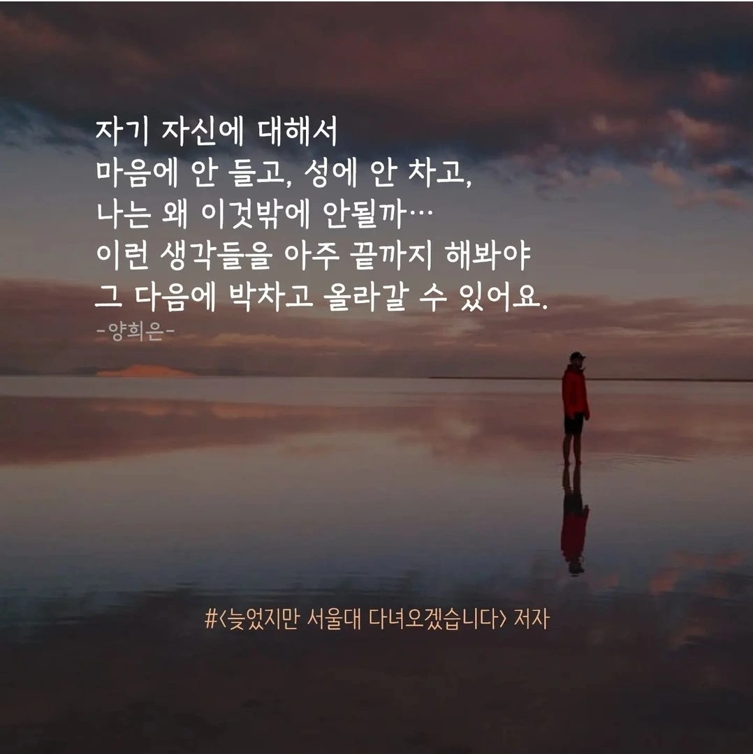 자기 자신에 대해서는 대부분 부정적으로 생각하기 쉽다. 자신만이 자신의 약점이나 치부를 정확히 알고 있기 때문에, 남들이 보는 자신의 모습 보다 단점에 포커싱 하게 된다. 남들은 자신을 쿨하게 보고 있지만 스스로는 속좁고 예민하다는 걸 알고 있다든지, 타인은 자신을 존경하고 동경하지만 스스로는 가정 문제나 기타 문제로 골머리를 앓고 있다든지, 남들은 자신의 스펙이나 배경을 부러워하고 있지만 정작 자신은 빛 좋은 개살구로 생각한다든지.. 자신과 타인이 보는 모습은 너무나 다르다. 그래서 타인이 모르고 있는 자신의 문제는 스스로 해결하는 수밖에 없다. 내가 마음에 안 들고 성에 차지 않는 부분이 무엇인지 내면 깊숙한 곳까지 파고들어서 찾아내야 한다. 타겟을 발견했다면 이제부터는 어떠한 모습으로, 어떻게 개선하고 싶은지 고민하고 실행에 옮기면 된다. 그것이 진정한 나를 만들어 가는 과정이다. by 책만장자 서변