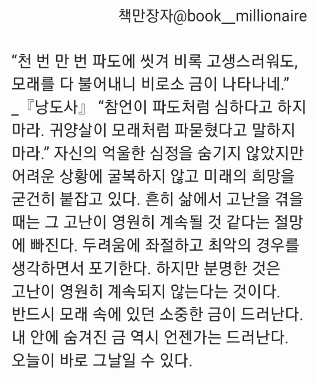 어두운 터널은 끝이 보이지 않을 것 같아도 끝이 보인다. 소나기는 계속 내릴 것 같지만 언젠가는 그친다. 괴롭고 힘든 인생의 시간은 비록 몇 십 년이 걸릴지라도 지나갈 것이다. 모든 것은 변하기에 희망도 있고 절망도 있다. 기쁜 일은 금방 사라지기에 절망이 될 수 있지만 슬픈 일도 사라지기에 희망이 될 수도 있다. 요즘 '코칭의 기술'이라는 수업을 듣고 있는데 기본적인 코칭 철학은 인간의 무한한 가능성을 인정하고 그 사람 내면에 답이 있다는 것을 믿는 것이라고 한다. 셀프코칭을 통해서 고난 속에서도 자신의 가능성을 의심하지 말고 내면에서 답을 찾고 현인의 도움을 구한다면 비로소 나타나는 금으로 현실부자와 마음부자가 될 것이다.