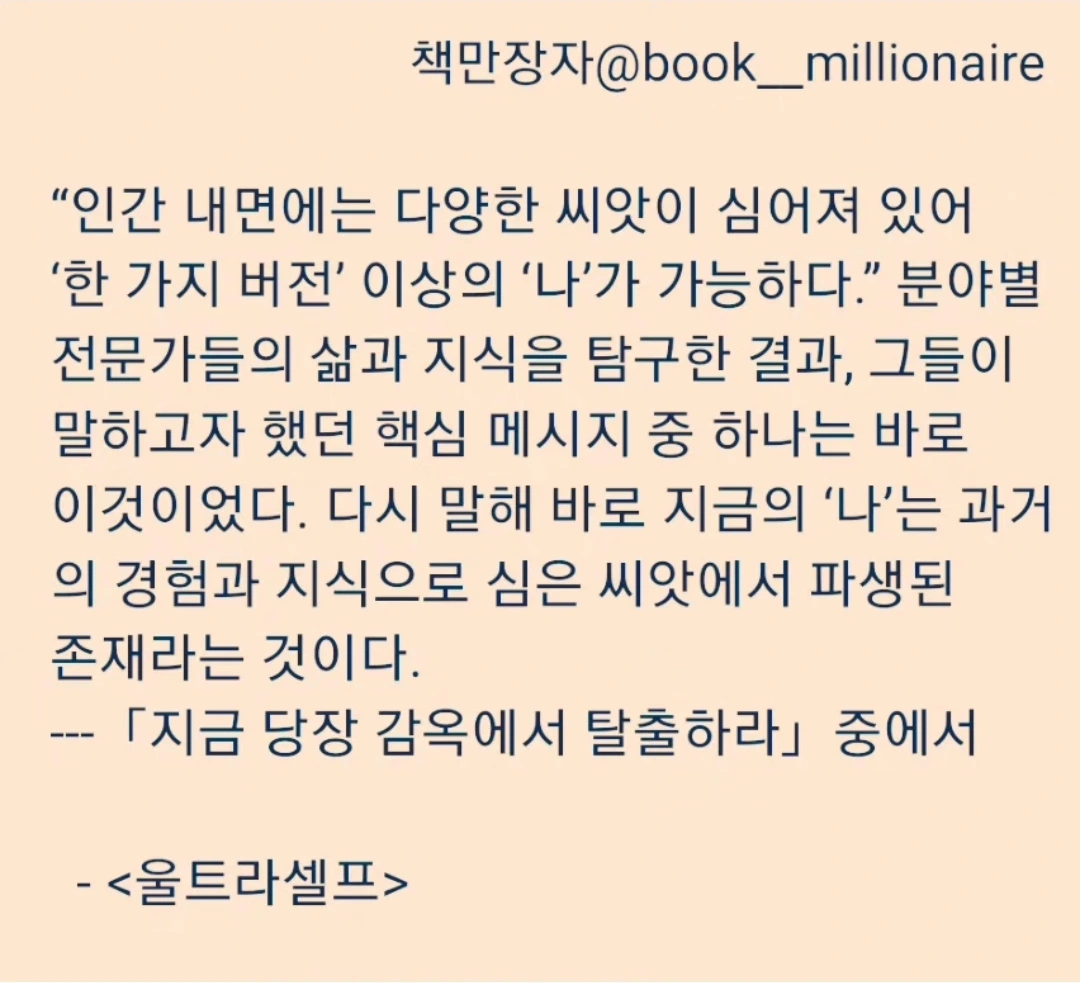 불가에서는 오늘 내가 쌓거나 짓는 업들이 모여서 자신의 미래뿐만 아니라 자신과 관계된 사람들의 미래에도 영향을 미친다고 한다. 지금의 나는 내가 과거에 했던 생각과 행동의 결과물이다. 지금 내 상황과 주변 사람들이 뜻대로 풀리지 않고 부정적인 방향으로 흘러가고 있다면, 내가 과거에 했던 생각이 잘못되었거나 바르지 못한 행동 탓일 수 있다. 반면에 지금의 모든 일들이 순조롭게 진행되고 나에게 좋은 사람들만 모인다면, 내가 과거에 했던 좋은 생각과 행동에 대한 보상일 것이다. 그래서 미래를 예측하는 가장 좋은 방법은 지금의 내 모습을 직접 관찰하면 된다. 지금 나에게 만족하면서 긍정적인 생각과 행동을 하고 있다면 분명히 밝은 미래를 맞이할 수 있을 것이다. 지금의 나를 통해 미래의 나에게 더 자유롭고 아름다운 삶을 선물하고 싶다.