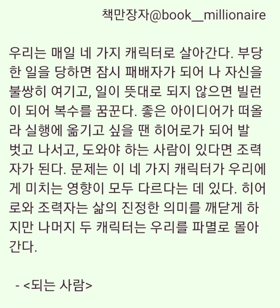 많은 사람들은 사회생활을 하다가 불합리하거나 불공정한 일도 당하거나 다른 사람의 배신이나 비난으로 괴로워하기도 한다. 조직 내에는 반드시 빌런 내지는 특이한 사람이 존재한다. 그런 사람들은 시간이 흘러서 자연스럽게 사라지기도 하지만, 끝까지 살아남아서 다른 사람들에게 피해를 끼친다. 심지어 본인은 다른 사람들에게 민폐가 되고 있는지 자각하지도 못한다. 한 사람으로 인해서 조직이 망가지고 한 사람으로 인해서 조직이 흥하기도 한다. 그렇기에 공동체를 형성하고 있는 인간의 기본 태도로서 최소한 에너자이저 내지는 조력자가 되려는 의지를 가져야 한다.
