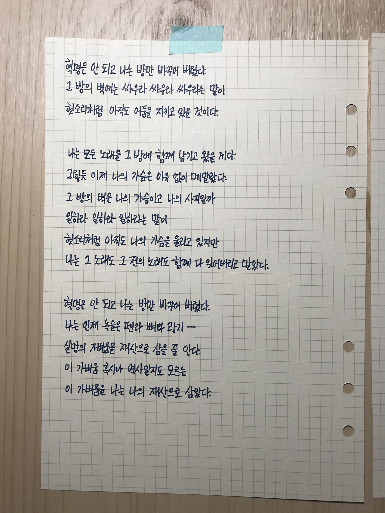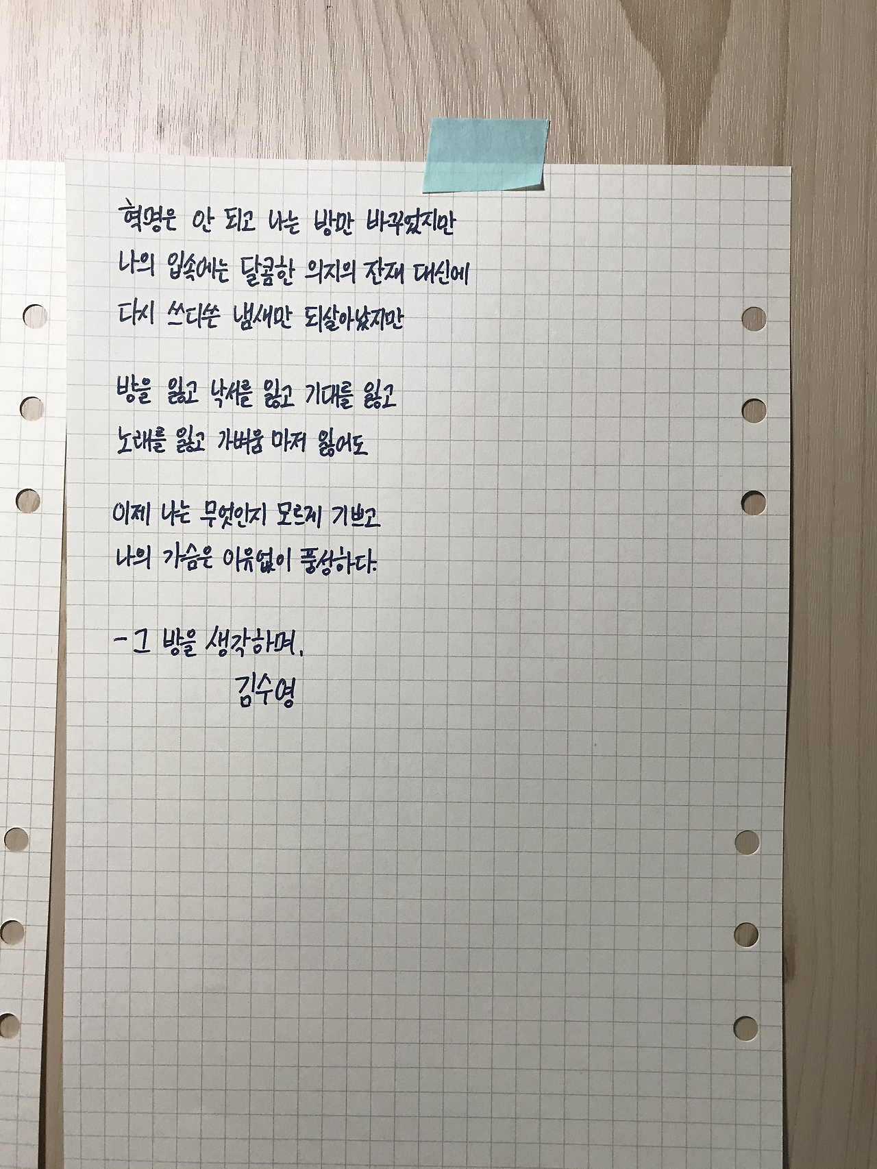 <그 방을 생각하며>가 떠올랐던 건 왜 일까? 아마도 화자의 마음, 생각이 나와 비슷해서 그럴 것이다. <그 방을 생각하며>가 쓰여진 시기는 4.19혁명 이후다. “혁명”을 바랬지만 이루어지지 않은 현실, “싸우라”, “일하라”는 말들이 헛소리처럼 공허해지고 “가슴은 이유 없이 메말랐다”. 진보했지만 진보하지 않은 상황에서 화자는 실망감에 몸부림친다. 그에게는 이제 방도, 낙서도, 기대도, 노래도, 가벼움마저도 잃었다.