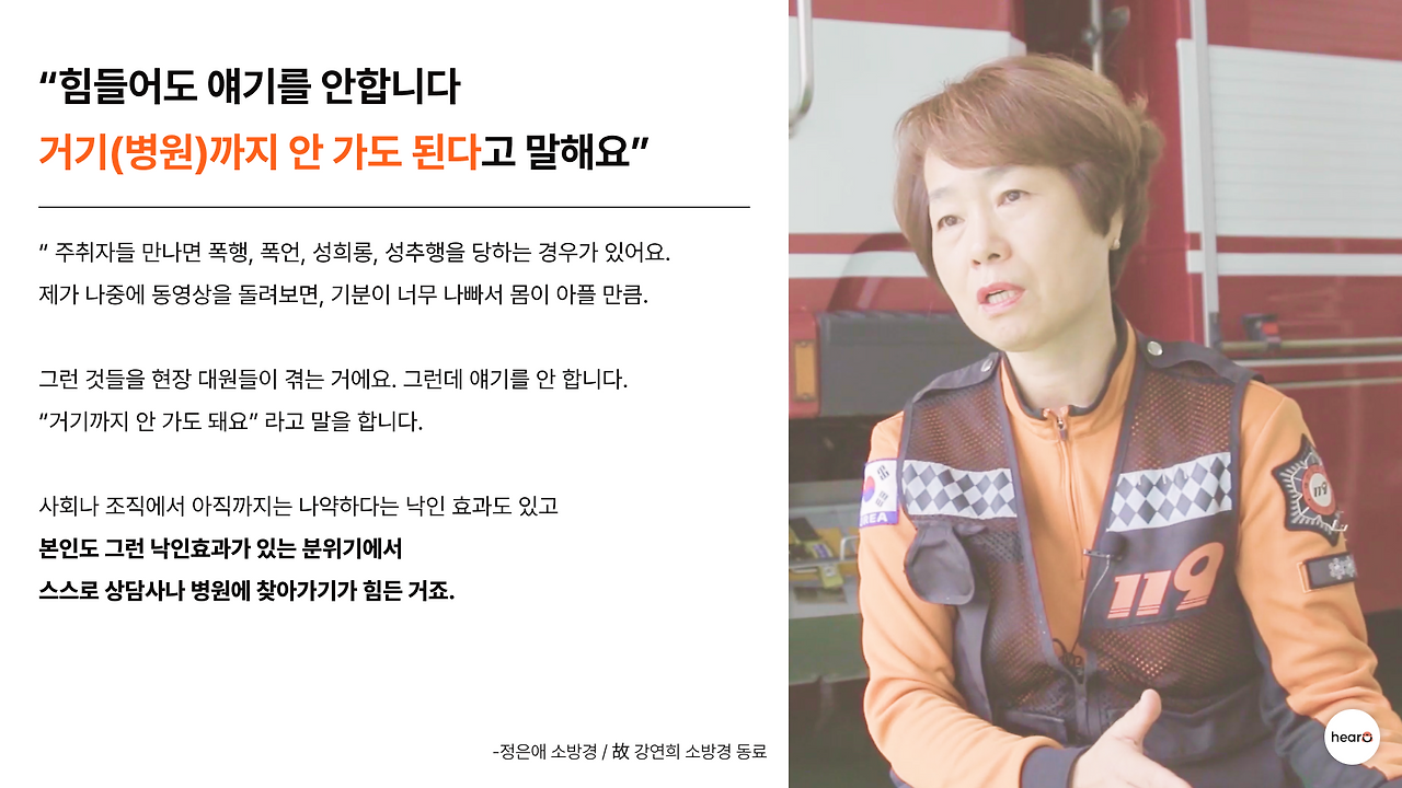 이 인식 때문에 소방관 자신도 힘든 부분을 외부에 말하기 어려운 것 같아요.