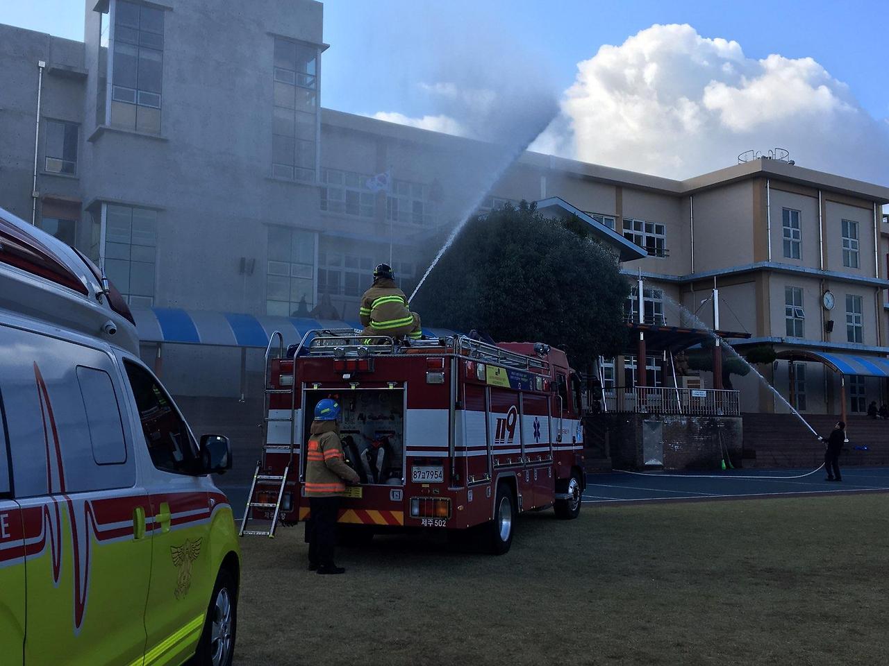 아니나 다를까 아이들은 운동장으로 대피 훈련을 실행함과 동시에 반 친구들끼리 왁자지껄 놀기 바빴고, 더러는 흙장난을 하며 아예 고개를 바닥에 파묻다시피 했다. 결국 대피 훈련 이후 예정된 안전교육 중 소화기 사용법은 대부분 선생님의 몫으로 돌아갔다. 소화기 교육을 마친 뒤엔 화재진압 시연이 있었다. 일부러 쌓아놓은 장작에 빨갛게 불이 붙고 회색 연기가 하늘로 폴폴 날리자, 장난기 가득하던 아이들은 순간 정적이 되고 일제히 그 불구덩이에 관심이 쏠렸다. 운동장 측면에 부서해둔 소방차에선 기다렸다는 듯 음성이 흘러나왔다.