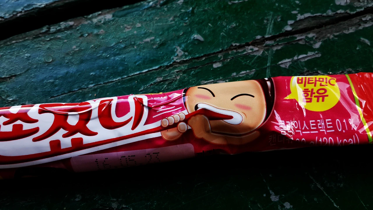 "불량식품 아니에요, 여기 보세요. 비타민이 들어있다잖아요"