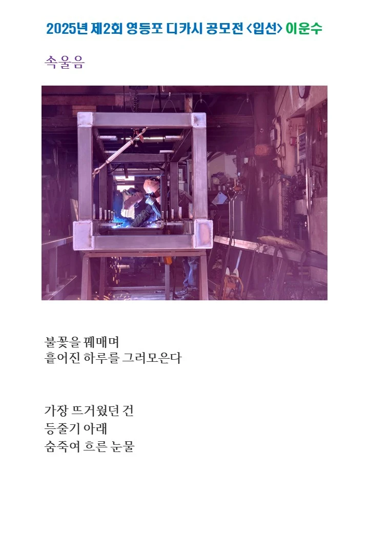 이 작품은 문래동 철공소 거리를 걷다 마주친 용접 장면을 담았습니다. 뜨겁게 튀는 불꽃 속에서 하루의 노동이 꿰매지고, 그 뒤편에는 아버지의 삶처럼 묵묵히 스며든 땀과 눈물이 있습니다.