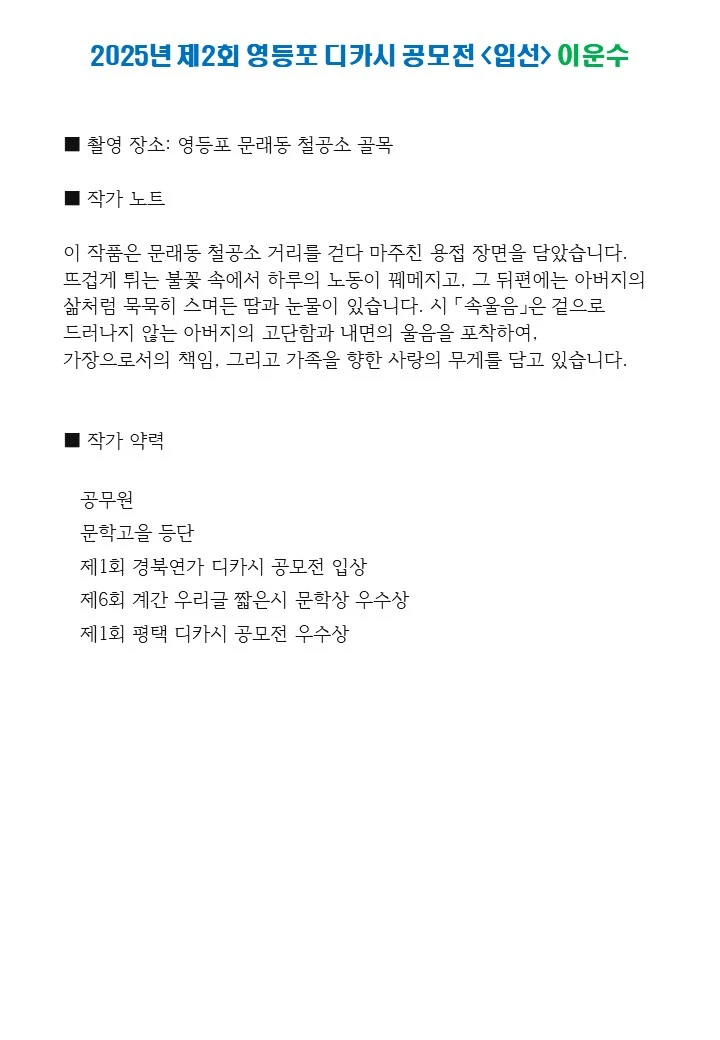 시 「속울음」은, 겉으로 드러나지 않는 아버지의 고단함과 내면의 울음을 포착하여, 가장으로서의 책임, 그리고 가족을 향한 사랑의 무게를 담고 있습니다.