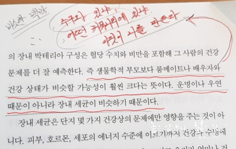 27p건드리 박사는 우리의 건강은 생물학적 유전자보다 현재 함께하고 있는 사람들의 생활방식에 따라 결정된다고 한다. 비슷한 맥락으로 나의 성장과 미래 또한 같다고 생각한다. 결국 누구와 함께 하느냐가 관건인 것이다. 나의 주변에는 이미 수많은 유익균 같은 사람들과 5성급 호텔의 건강한 커뮤니티가 있다. 그 속에서 성장하고 성공하는 것은 나의 몫이다. 더 나아가 나 또한 누군가에게 유익균과 같은 좋은 존재가 되고 좋은 환경을 만들어 줄 수 있는 리더가 되어야겠다고 다짐해본다.
