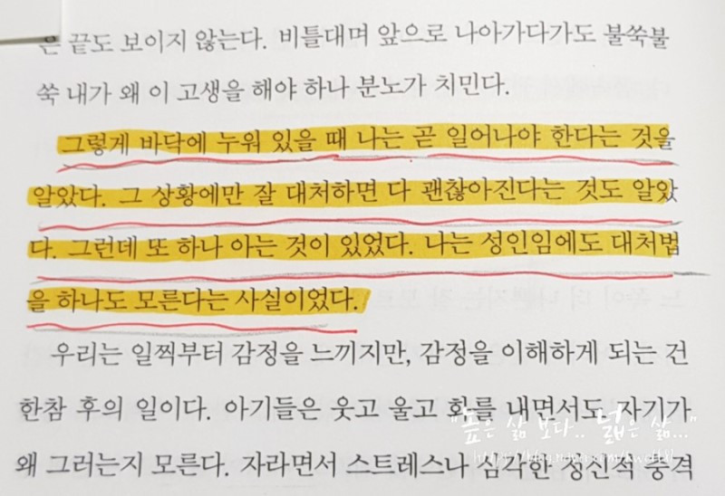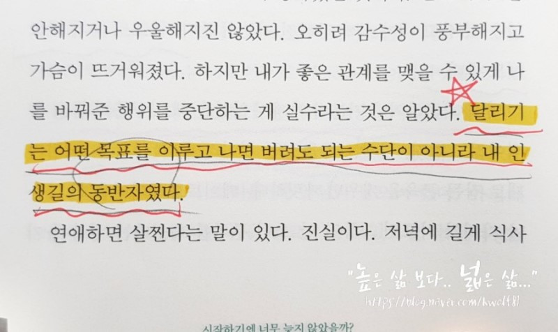 특히, 이 책이 가진 장점이 몇 가지가 있는데,첫 번째는 속 시원한 저자의 말투다. 그 덕에 재미있게 읽힐 뿐만 아니라 거침없이 내뱉는 글을 읽다 보면 속이 다 후련해진다.두 번째는 저자 자신의 경험뿐 아니라 방대한 참고 자료를 통해 달리기와 정신 건강의 상관관계, 그리고 우리가 정신 질환에 대해 가진 잘못된 인식을 바로 잡게 해 준다. 또한 실제 우리가 흔히 앓게 되는 정신 질환은 어떤 것이 있는지 알려줌으로써 마치 한 권의 건강서적을 보는 느낌이다.마지막으로는 솔직 담백하고 때로는 적나라한 정신 질환의 묘사 및 극복과정이 나 같은 사람에게 있어서는 그 어느 자기 계발 서적 이상의 큰 감동과 깨달음을 주었다는 것이다. 이런 걸 1타 3피라 해야 하나... 어쨌든 다시 내 이야기로.