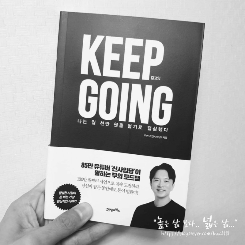 저자인 '주언규'는 '신사임당'으로 더 많이 알려져 있는 무려 구독자 85만의 유튜버이다. 대학 졸업 후 SBS미디어넷 사업팀, 한국경제 TV 증권팀에서 PD로 일했고, 이후 회사를 그만두고 온/오프라인 매장 운영하며 유튜브 방송을 하는 사업가로서 활동하고 있다. 그를 처음 본 것은 우연히 유튜브를 통해서이다(우리는 늘 우연의 접점 속에 살고 있다). 수줍어 보이는 듯하면서도 자신만의 뚜렷한 철학이 있는 모습이 좋았다. 그의 책 <KEEP GOING(킵고잉)>은 그가 실제로 경험한 것을 바탕으로 쓰였다. 학창 시절엔 왕따이기도 했고 너무나 평범한 사람이었던 그가 경험하며 이루어낸 성공 스토리를 얽어나가면서 공감이 되는 부분이 많았다.