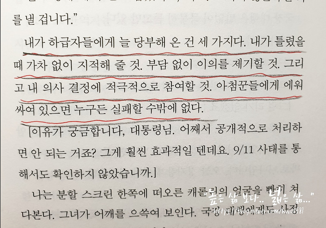 - 266p두 번째는 배울 점들이다. 소설 속에 나오는 주인공(대통령)의 대사나 모습을 보고 있으면 한 국가의 리더로서의 위기 돌파 능력과 통찰, 용기에 감탄하고 또한 인간으로서 따뜻한 매력을 느끼기에 충분했다. 어떠한 부분들은 마치 빌 클린턴 자신이 대통령을 역임하면서 경험했던 것들과 못다 이룬 것들에 대해 이야기를 하고 있다는 느낌이 들 정도였다.