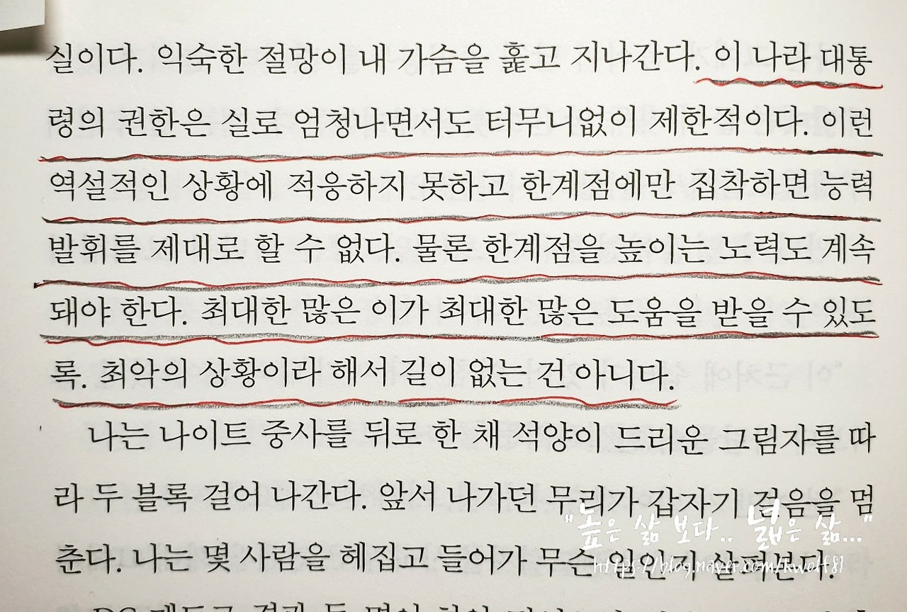 빌 클린턴이 미국의 정치사에 한 획을 그은 것은 사실이지만 대통령으로 있는 동안 '섹스 스캔들'이라는 오점을 남기기도 했다. 한 국가의 리더로서는 도저히 용납이 되지 않는 잘못을 저지른 것이다. 잘못을 했으면 당연히 죗값을 치러야 한다. 거기에는 그 어떤 합리화도 용납될 수 없다. 하지만 미국이라는 나라가 대단하고 생각했던 것은 과오를 저지른 전직 대통령에게도 기회가 주어졌다는 것이다. 마녀사냥 혹은 주홍글씨를 박아 완전히 사람을 매장해버리는 우리나라와는 사뭇 다른 모습이다. 코로나 19 사태를 맞아 우리나라의 국민의식이 높게 재평가되었다. 하지만 우리나라 또한 아직도 가야 할 길이 먼 것은 사실이다. 책을 접하면서 문제 해결을 위해 우리나라와 리더들이, 그리고 우리 각자가 무엇을 해나가야 하는지 생각해 보는 계기가 되었다. 물론 미국과 우리나라는 다르고 소설 속의 내용에 환상이 있는 것은 사실이다. 하지만 그렇다고 우리가 더욱더 성장할 수 있는 계기와 교훈을 외면한다면 우리 또한 결국 그 자리에 머물게 될 것이다.